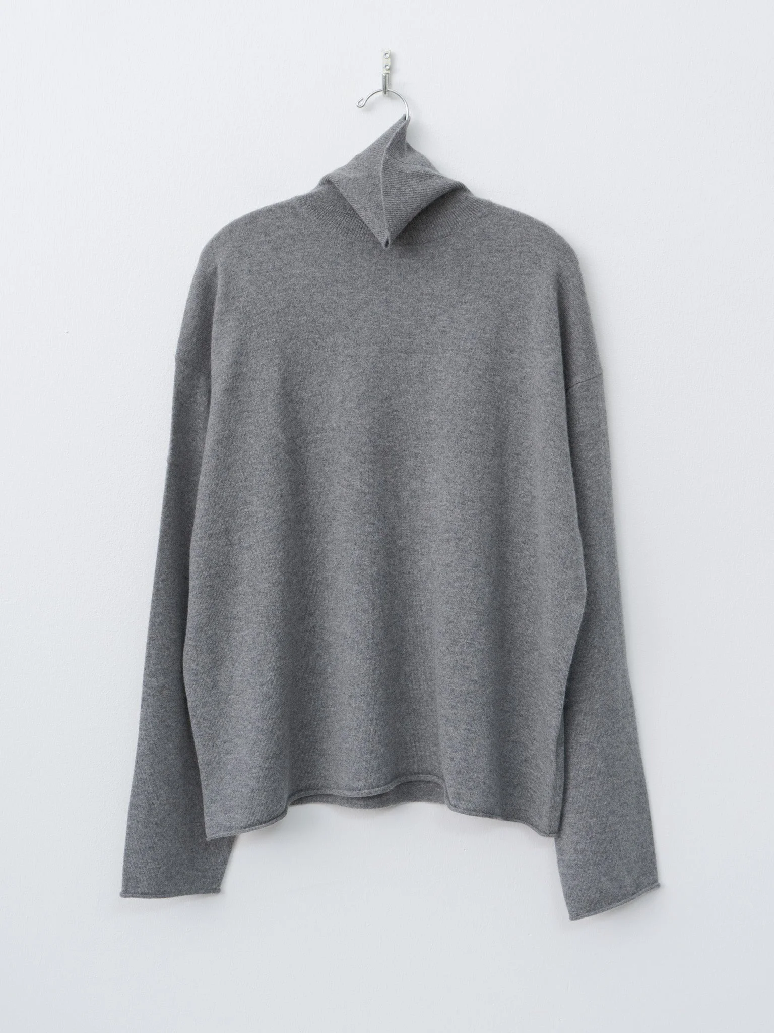The Marchi Sweater is an oversized turtleneck crafted from ultra-soft, lightweight 1-ply cashmere. It features dropped shoulders, a longer hem and cuffs, and rolled edges at the cuffs and hem. It makes for a great layer - adding warmth without bulk. - Made in Belgium - 100% Cashmere - Available in Mid Grey Melange and Ivory - The model is 5'7"/170 cm and wears size S