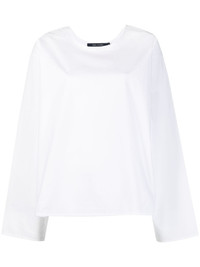 plain long-sleeve blouse white cotton crew neck long sleeves rear curved hem Imported Composition Cotton 100% SIZE & FIT Model measurements Height 5 ft 9 in(1.76 m) Bust/Chest 33.07 in(84 cm) Hips 38.58 in(98 cm) Waist 24.8 in(63 cm) FittingInformation This piece fits true to size. We recommend you get your regular size Cut for a loose fit Made with a mid-weight non-stretch fabric Washing instructions Machine Wash