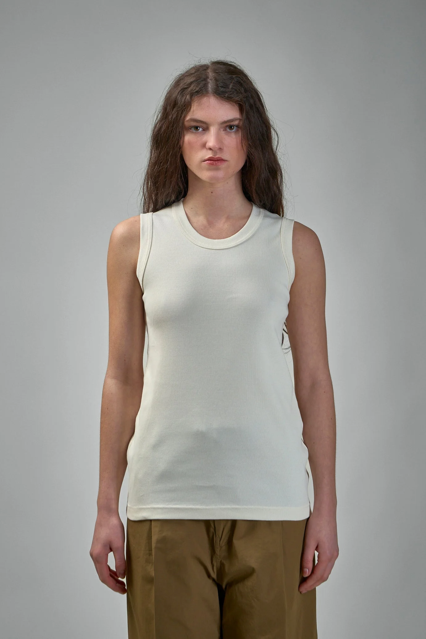 - round neck - ribbed Materials: 98% cotton, 2% elastane Color: ivory SKU: 150003 Brand style: S25-TANK-JRIB-01 Size and Fit The model is 1.76m (5.8ft) and wears a size 36. Cut close to the body, emphasizing the silhouette. Recommended if you prefer a more form-fitting style.