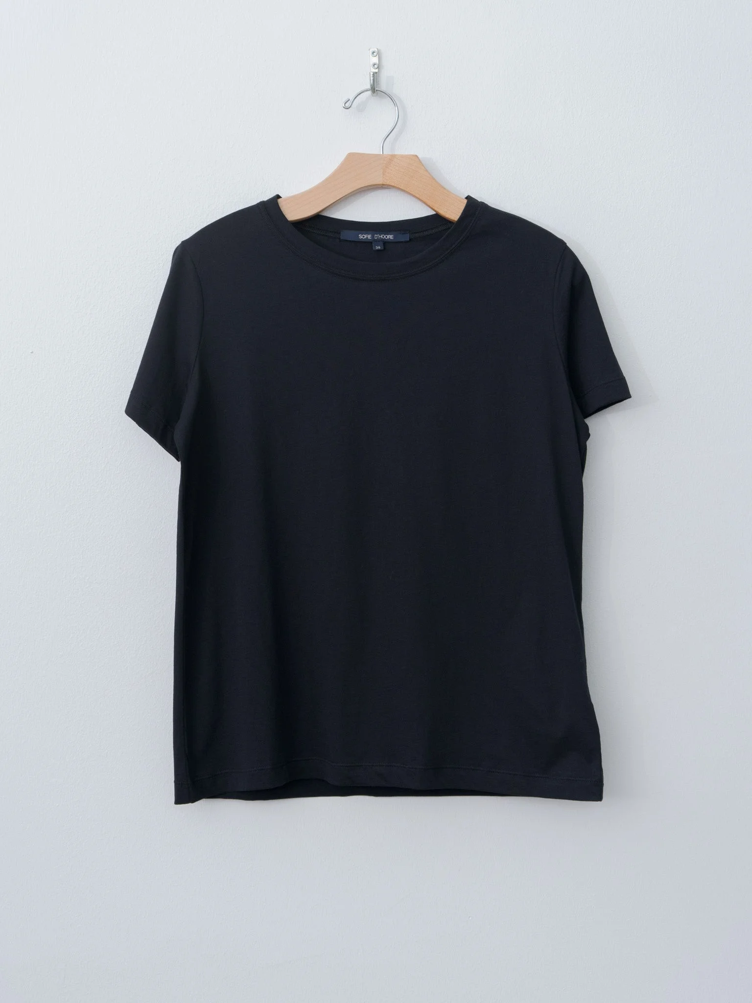 The Turin Tee is a loose fit short-sleeve tee made from a super fine cotton jersey. It feels lightweight and soft and looks great tucked in or out. - Made in Portugal - 100% Cotton - Available in Ivory, Sky, Black - The model is 5'7"/170 cm and wears size 36/S