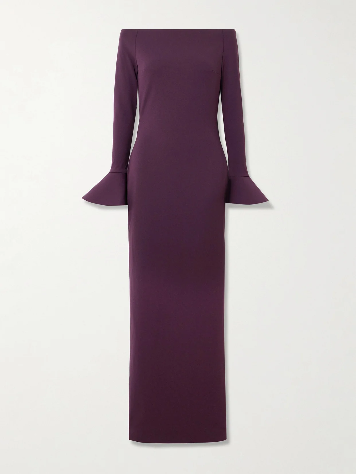 The fluted cuffs of Solace London's 'Anica' gown provide contrast to the simple column shape. It's made from crepe in a deep plum shade and has an elegant off-the-shoulder neckline. Lift the floor-skimming hem with heels.