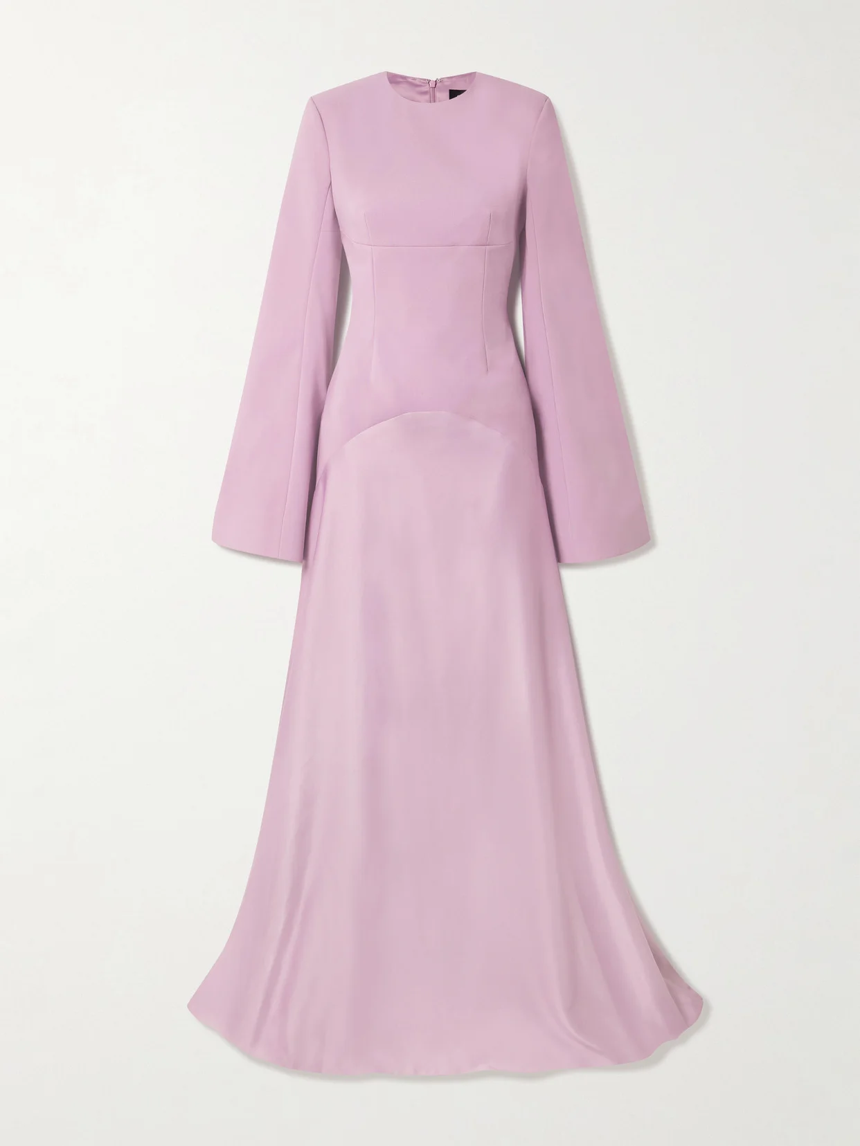 Solace London's 'Claudine' gown is both modern and timeless. Made from smoothing crepe, it's fitted through the body and has flared sleeves and a satin skirt that flows elegantly. Complement the 'Wisteria' shade with silver or diamond jewelry.