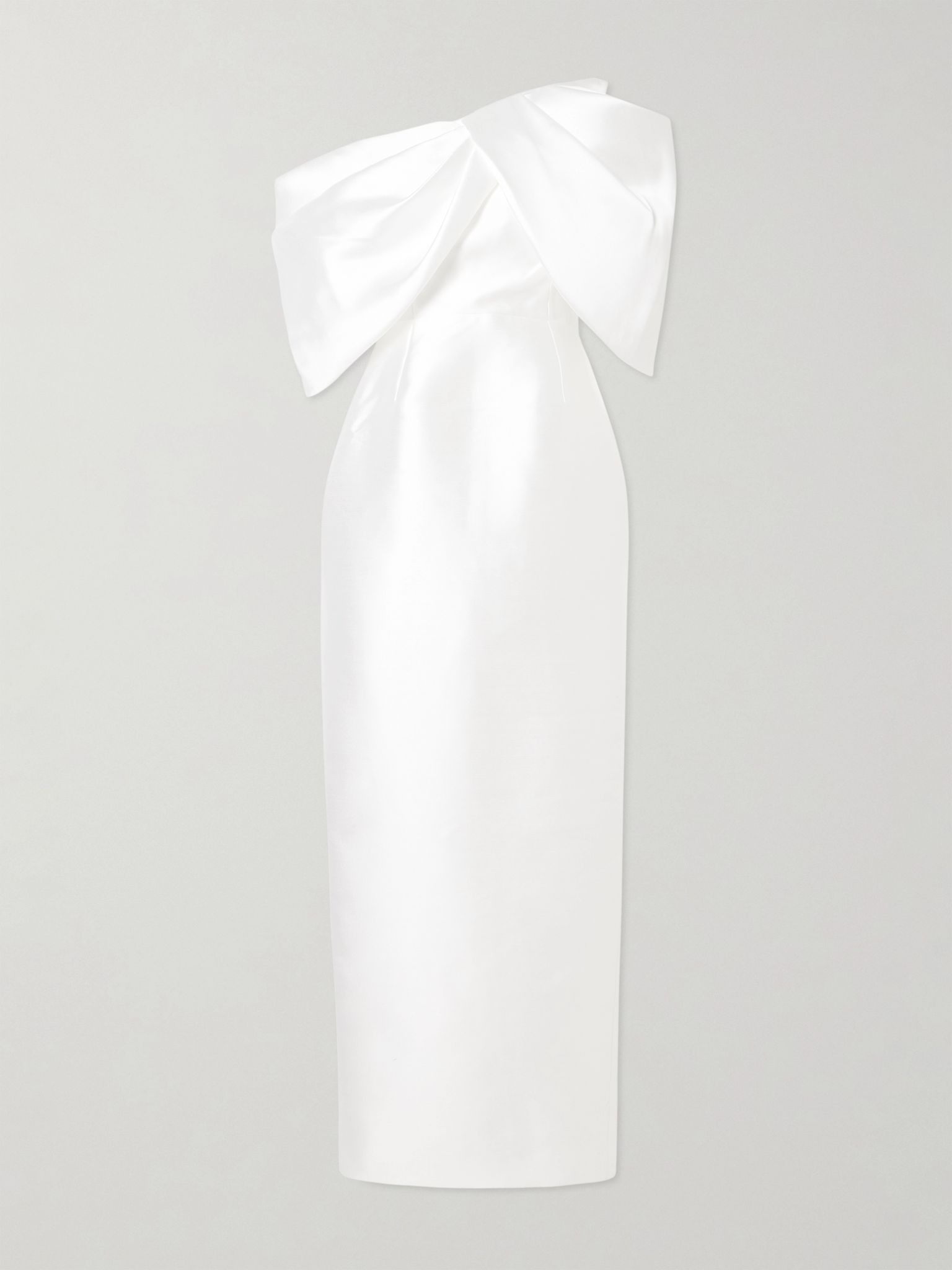 Solace London's 'Davina' gown is cut from lustrous faille with a column-shaped skirt framed by an asymmetric off-the-shoulder neckline that drapes along the fitted bodice. Wear yours with pumps and statement earrings. Size & Fit - Fits true to size, take your normal size - Cut to be fitted at the bust and waist, slightly loose at the hip - Mid-weight, non-stretchy fabric - Model is 175cm/ 5'9" and is wearing a UK 8 Model measurements: - Bust: 82cm/ 32" - Waist: 65cm/ 26" - Hip: 92cm/ 36" Details & Care - Cream faille - Concealed hook and zip fastening at side - 52% viscose, 48% acetate - Fully lined - Dry clean