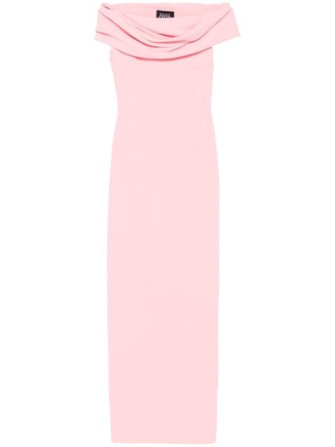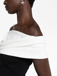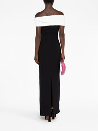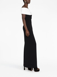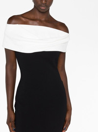The Eva off-shoulder dress Solace London says its designs are a fusion of ‘modern futurism balanced with timeless minimalism’ – a verve showcased across The Eva dress. Recalling old Hollywood styles, its sleek black stretch-crepe base remains understated to keep the focus on the contrasting white panel that drapes elegantly around the shoulders. Highlights - Black/white - Stretch-design - Crepe texture - Two-tone design - Off-shoulder - Rear slit - Ankle-length - Straight hem Imported Composition Polyester 100% SIZE & FIT Model measurements Height 5 ft 10 in(1.77 m) Bust/Chest 32.28 in(82 cm) Hips 35.03 in(89 cm) Waist 25.19 in(64 cm) Measurement HIPS 31.49 in(80 cm) LENGTH 55.51 in(141 cm) WAIST 22.83 in(58 cm) FittingInformation Designed for a slim fit that sits just away from the body offering a close yet comfortable fit The vented hem offers movement at the rear Made from a midweight non-stretch fabric This piece fits true to size – take your usual size Washing instructions Dry Clean Only