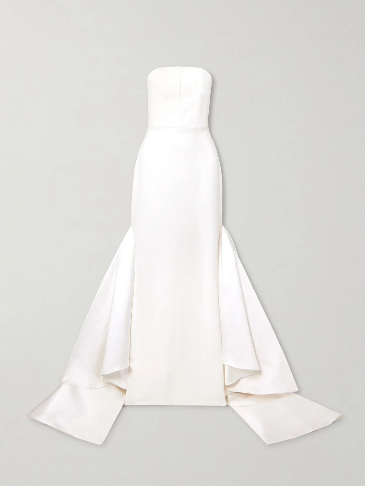 Solace London describes its collections as "bold; confident and refined;" and this 'Jodi' gown ticks every box. Perfect for modern brides, it's cut from smooth crepe in a fitted hourglass shape and has a beautifully draped satin-twill train. The strapless neckline calls for diamonds.