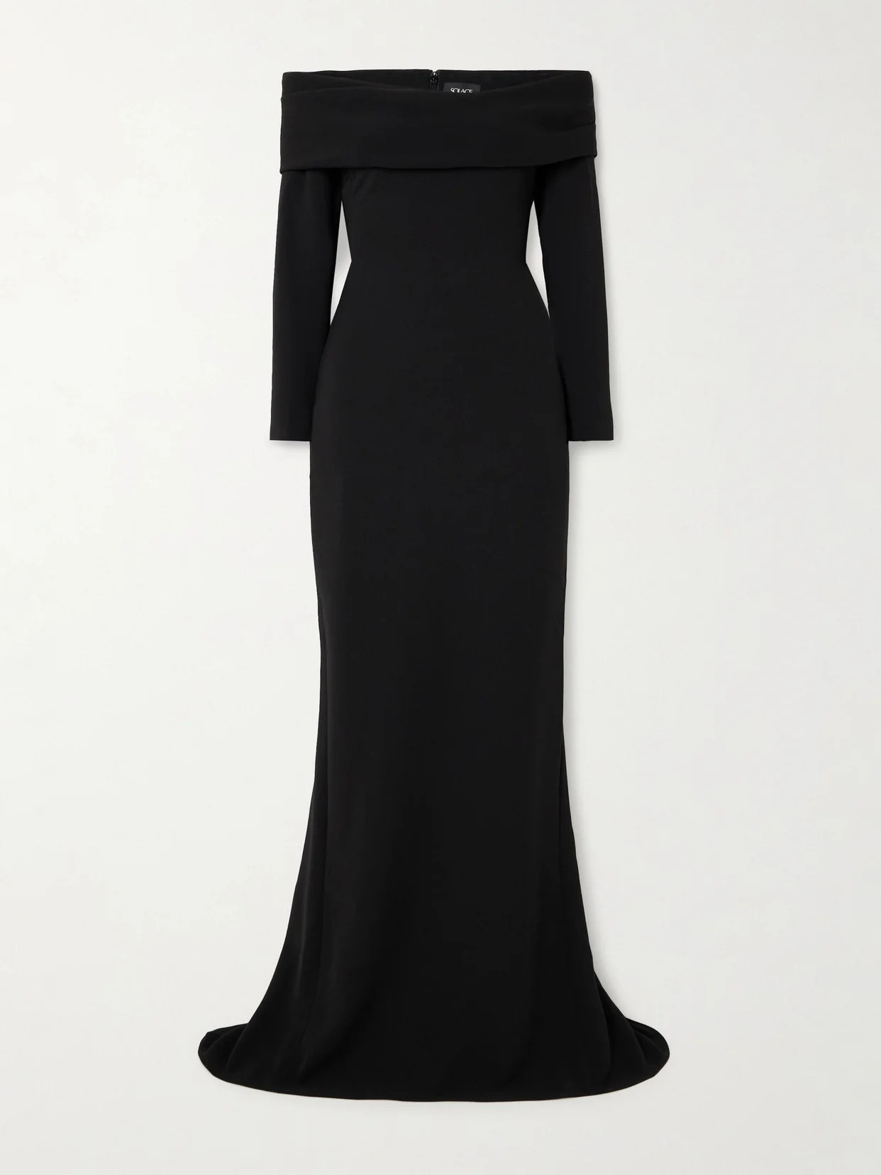 Solace London's 'Lyla' gown is the definition of eternal elegance. Made from fluid black crepe, it has a folded off-the-shoulder neckline and hugs your waist before falling to a dramatic sweeping train. Keep the styling simple with a sleek clutch and heels.