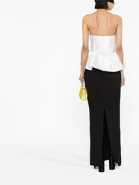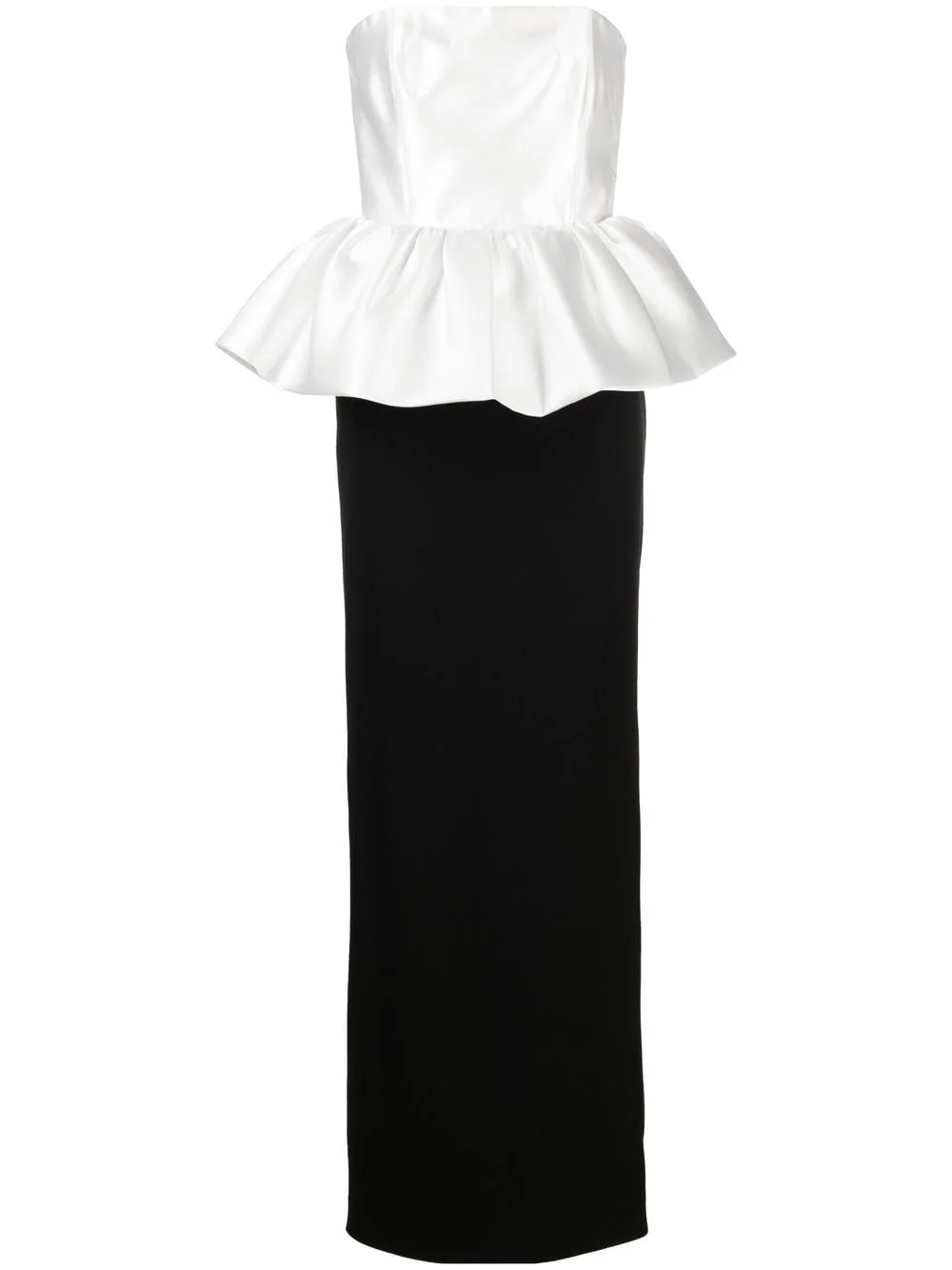 Maddison strapless dress Solace London's Maddison dress brings elegance and drama in its floor-length silhouette. Crafted in a monochromatic colour palette, the white satin body is differentiated from the straight skirt by a ruffled peplum waist which emphasises the striking contrast. Imported Composition Polyester 100% Lining: Polyester 95%, Elastane 5% SIZE & FIT Model measurements Height 5 ft 10 in(1.78 m) Bust/Chest 29.92 in(76 cm) Hips 34.64 in(88 cm) Waist 23.62 in(60 cm) FittingInformation This piece fits true to size. We recommend you get your regular size Cut for a slim fit Made with a mid-weight fabric Washing instructions Dry Clean Only