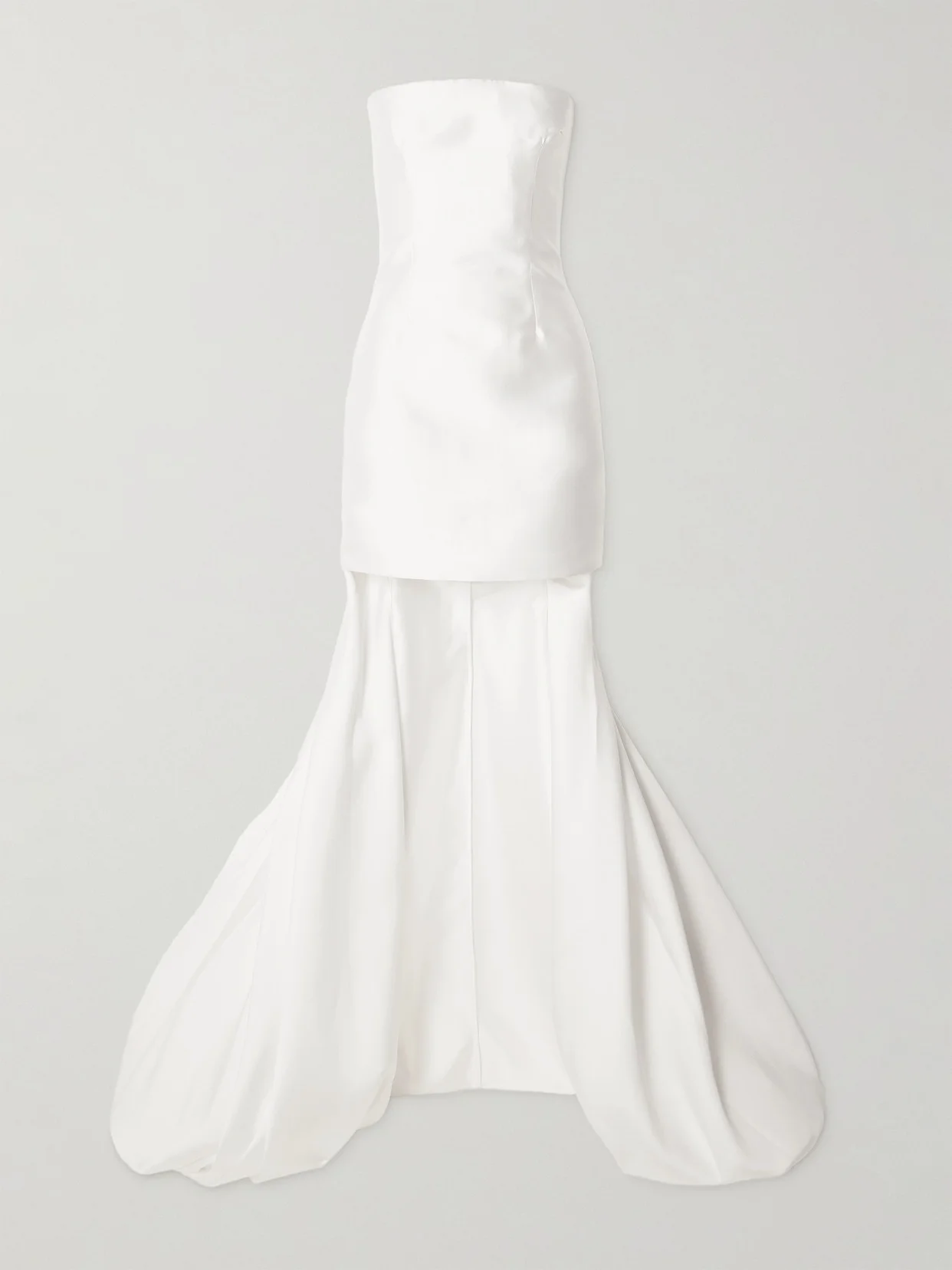 "Bold; confident, refined;" is how founders Laura Taylor and Ryan Holliday-Stevens describes Solace London's collections. Perfect for formal occasions or any modern bride's reception, this strapless 'Neva' gown is made from lustrous satin-twill that fits slim through the gently structured body before falling to a dramatic, floor-sweeping train.