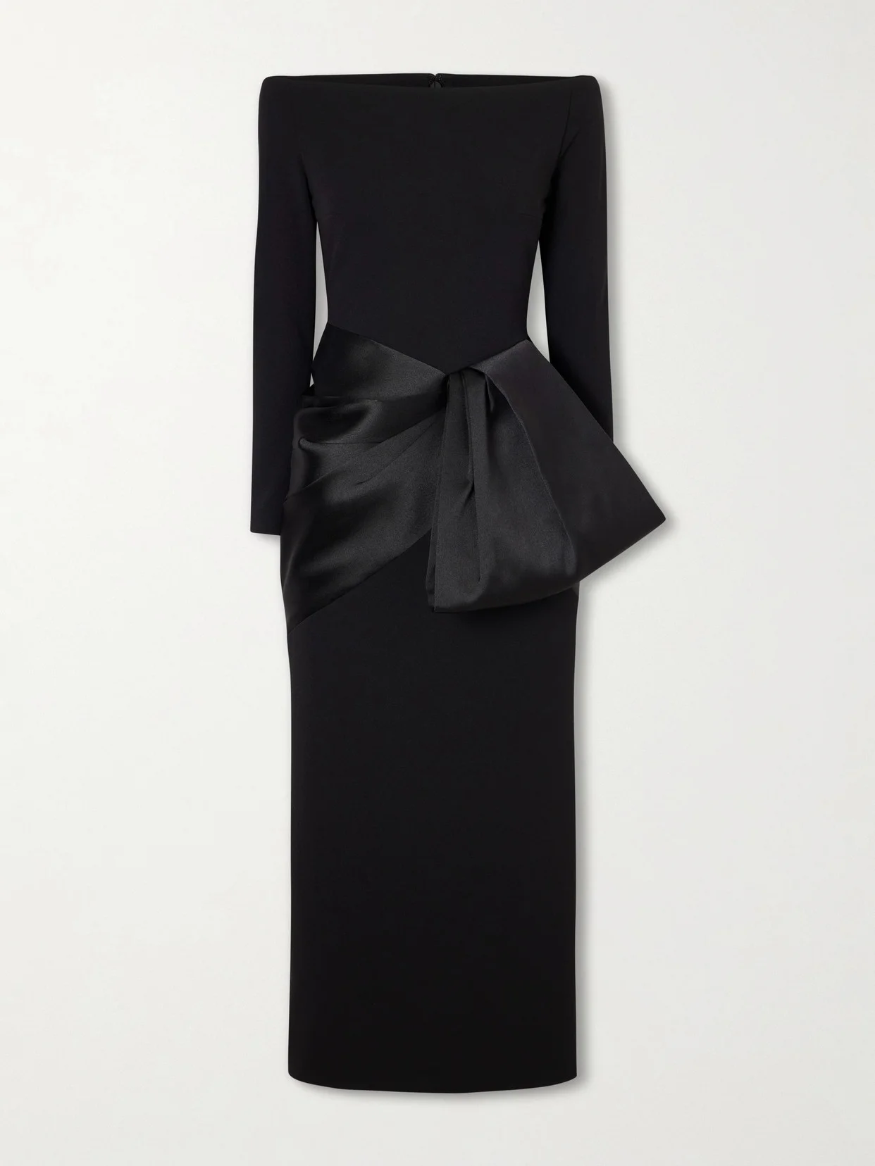 Solace London's 'Rihanne' midi dress reflects the label's sculptural approach to occasionwear. Made from crepe for a streamlined silhouette, it's framed by an off-the-shoulder neckline and gathered with a dramatic satin bow at the waist.
