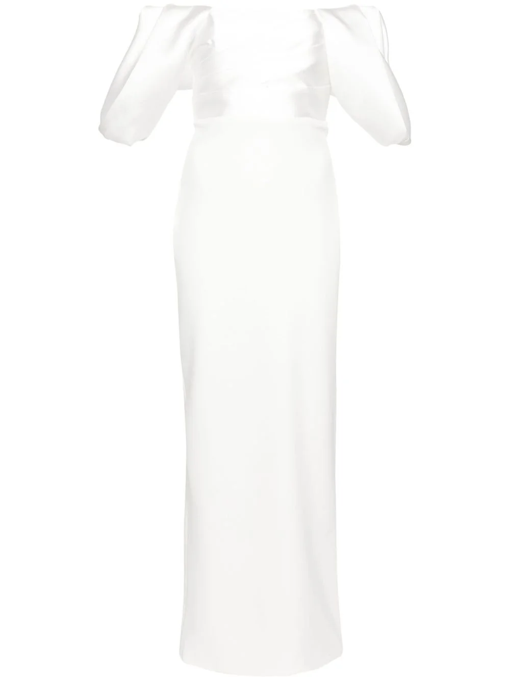 Sian off-shoulder gown Highlights - White - Crepe texture - Satin-finish panelling - Strapless - Off-shoulder - Voluminous short sleeves - Fitted waistline - Maxi skirt - Rear slit - Straight hem - Concealed rear zip fastening Imported Composition Lining: Polyester 95%, Spandex/Elastane 5% Outer: Polyester 100% SIZE & FIT Model measurements Height 5 ft 9 in(1.75 m) Bust/Chest 31.88 in(81 cm) Hips 34.64 in(88 cm) Waist 24.01 in(61 cm) Measurement LENGTH 53.14 in(135 cm) WAIST 29.13 in(74 cm) HIPS 37.79 in(96 cm) FittingInformation Designed for a close fit throughout The vented hem offers movement at the rear Made from a midweight fabric This piece fits true to size – those with a fuller chest may wish to take one size up Washing instructions Dry Clean Only