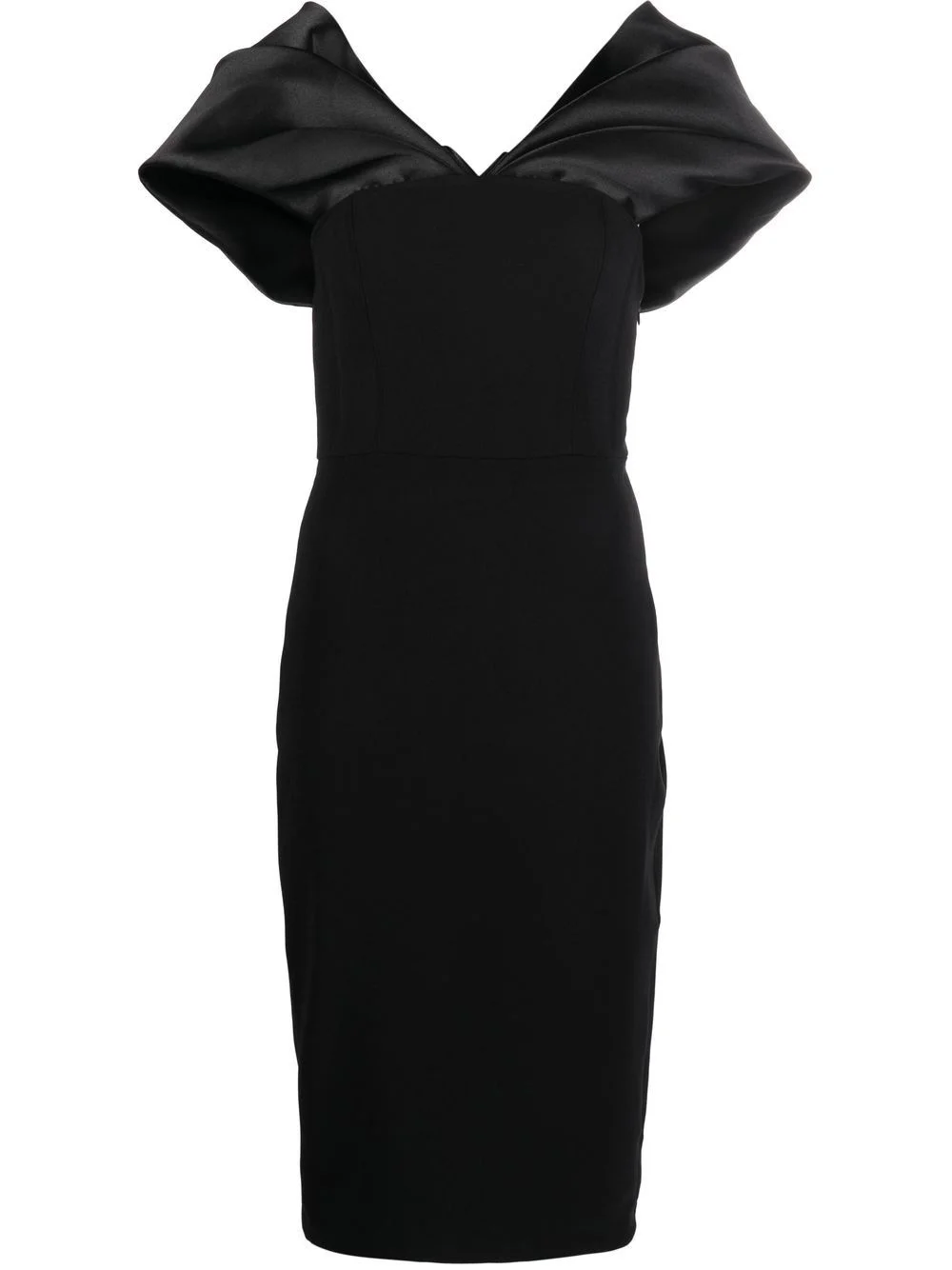 Wrenley off-shoulder midi dress Solace London creates pieces that blend a statement aesthetic and versatility, as seen with the Wrenley midi dress. The black-hued garment has a draped off-shoulder design, enhanced by a delicate sweetheart neckline. Imported Composition Outer: Polyester 100% Lining: Polyester 95%, Elastane 5% SIZE & FIT Model measurements Height 5 ft 10 in(1.77 m) Bust/Chest 31.49 in(80 cm) Hips 35.03 in(89 cm) Waist 23.22 in(59 cm) FittingInformation This piece fits true to size. We recommend you get your regular size Designed for a close fit at the bust, waist and hips Made with a mid-weight fabric