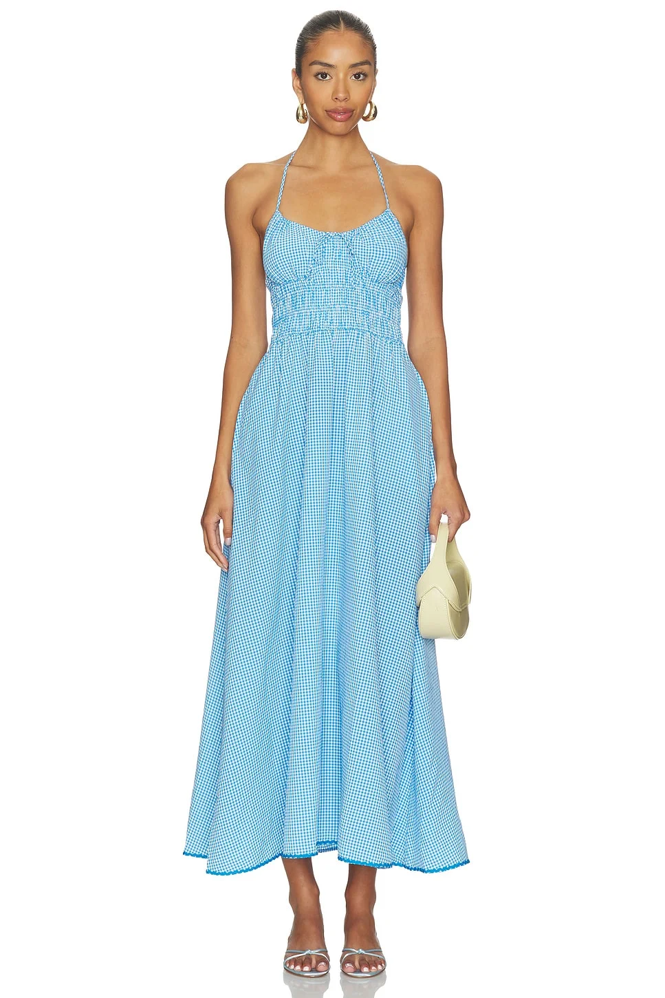 - 95% polyester, 5% spandex - Made in China - Hand wash cold - Unlined - Tie halter neck fastening - Poplin fabric - Softly ruched waist and bow on front - Revolve Style No. SLST-WD147 - Manufacturer Style No. RE26-R3348GIN-CSB