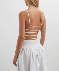DETAILS Linen top Smocked detailing Adjustable straps Elastic-encased back straps Ruffled hem Cropped waist SIZE & FIT Model is 179cm/5'10.5"; Chest: 81cm; Waist: 64cm; Hip: 89cm and wears S COMPOSITION & CARE 50% Linen; 47% Rayon; 3% Spandex Machine wash cold. Lay flat to dry. Do not tumble dry