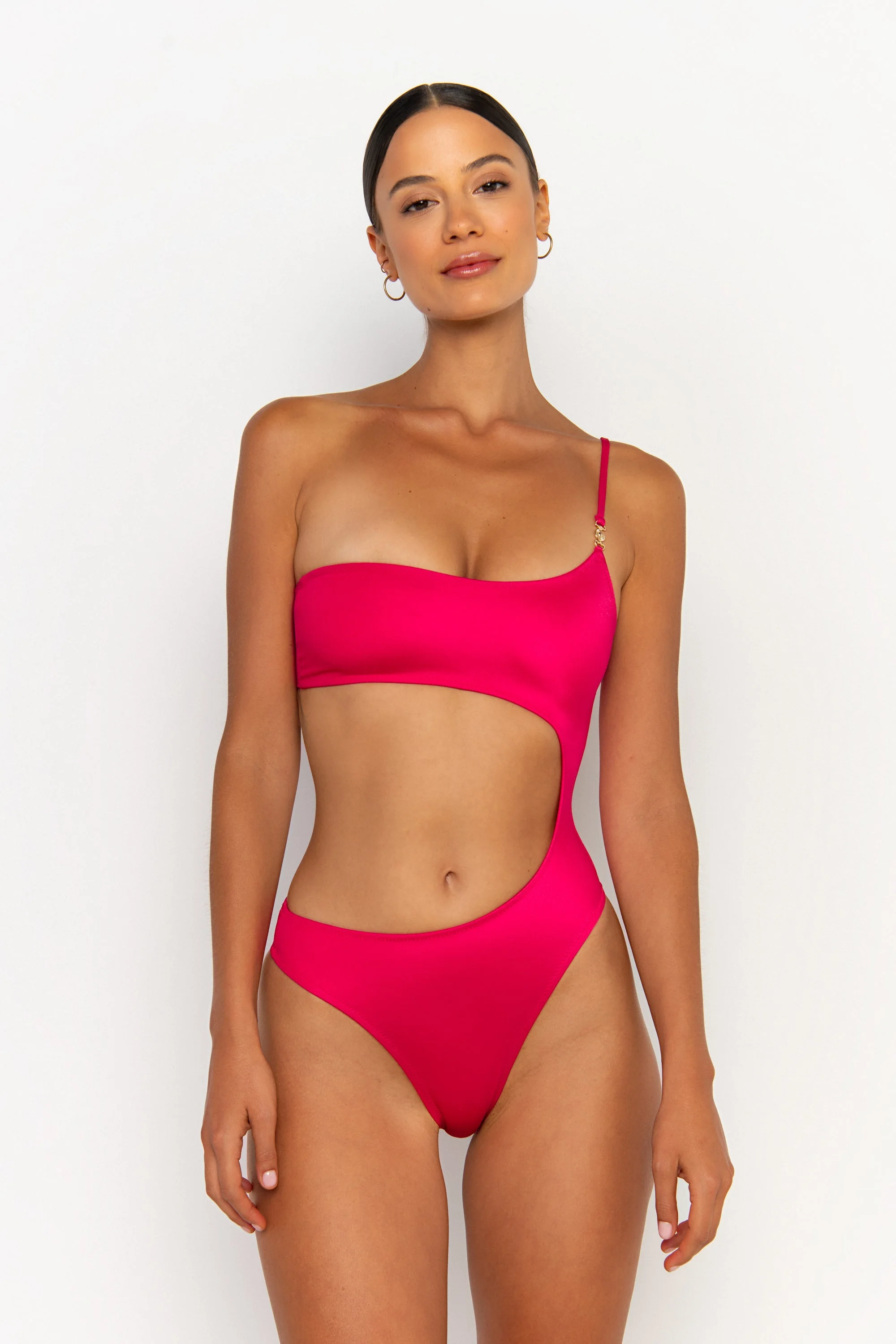 DETAILS Features - One shouldered one-piece - Unique gold embellishment - Cheeky coverage - Delicate strap - Luxurious feel - Lustrous shine - Double lined - Minimal to medium coverage - Finest quality Italian Xtra Life Lycra - 80% Nylon 20% Elastane Care Instructions To ensure correct treatment please refer to individual care labels on each product. Rinse after use, Cold gentle machine wash separately or hand wash with lukewarm water using mild detergent. Dry in shade. Model Size & Fit Our model is wearing a size S in the one-piece. She is 174cm tall measuring 85cm bust, 61cm waist and 91cm hips with a full B cup.