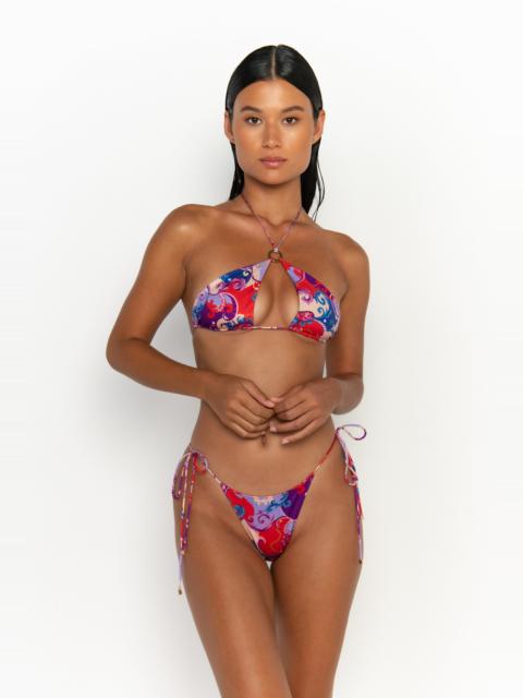 The Celene in Rococo by Sommer Swim is a halter style bikini top with a gold front ring feature, delicate string detailing and adjustability around the neck and back to tie. As part of Sommer Swim's Arabesque swimwear collection, this halter bikini top has luxurious features which include a lustrous shine and double lining for comfort and support. Mix and match the Celene Rococo Top with any Sommer Swim bikini bottoms. Explore more effortlessly stylish swimwear options from our halter bikini top collection. DETAILS Features - Halter style bikini top - Front gold ring feature - Adjustable delicate strings - Tie neck and back - Luxurious feel - Lustrous shine - Double lined - Minimal coverage - Finest quality Italian Xtra Life Lycra - 80% Nylon 20% Elastane Care Instructions To ensure correct treatment please refer to individual care labels on each product. Rinse after use, Cold gentle machine wash separately or hand wash with lukewarm water using mild detergent. Dry in shade. Model Size & Fit Our model is wearing a size S bikini top and size S bikini bottoms. She is 174cm tall measuring 86cm bust, 61cm waist and 91cm hips with a full B cup.