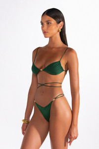 The Ella in Ivy by Sommer Swim is a bralette bikini top with visible tie features, delicate gold hardware, adjustability for coverage with an embossed gold clip closure. As part of Sommer Swim's Coco LaRouge swimwear collection, this bralette bikini top has luxurious features which include a lustrous shine and double lining for comfort and support. Mix and match the Ella Ivy Top with any Sommer Swim bikini bottoms. DETAILS Features - Bralette bikini top - Light to medium support - Thin straps - Adjustable coverage and straps - Gold trim - Luxurious feel - Lustrous shine - Double lined - Minimal to Medium coverage - Finest quality Italian Xtra Life Lycra - 80% Nylon 20% Elastane Care Instructions To ensure correct treatment please refer to individual care labels on each product. Rinse after use, Cold gentle machine wash separately or hand wash with lukewarm water using mild detergent. Dry in shade. MODEL SIZE & FIT Our model is wearing a size S bikini bottom and size S bikini top. She is 178cm tall measuring 87cm bust, 61cm waist and 93cm hips with a full C cup.