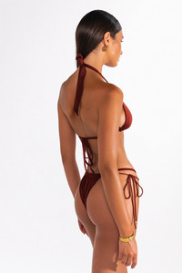 The Farrah in Ribera by Sommer Swim is a tie side bikini bottom featuring an adjustable brazillian cut. As part of Sommer Swim's Coco LaRouge swimwear collection, this tie side bikini bottom has luxurious features which include a lustrous shine and double lining for comfort. Mix and match the Farrah Ribera bottom with any Sommer Swim bikini tops. DETAILS Features - Tie side bikini bottom - Brazillian cut - Double string - Luxurious feel - Lustrous shine - Double lined - Finest quality Italian Xtra Life Lycra - 80% Nylon 20% Elastane Care Instructions To ensure correct treatment please refer to individual care labels on each product. Rinse after use, Cold gentle machine wash separately or hand wash with lukewarm water using mild detergent. Dry in shade. MODEL SIZE & FIT Our model is wearing a size S bikini bottom and size S bikini top. She is 178cm tall measuring 87cm bust, 61cm waist and 93cm hips with a full C cup.