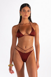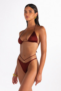 The Stella in Ribera by Sommer Swim is a mini halter style triangle bikini top featuring simplistic coverage and adjustable neck and back tie. As part of Sommer Swim's Coco LaRouge swimwear collection, this triangle bikini top has luxurious features which include a lustrous shine and double lining for comfort and support. Mix and match the Stella Ribera bikini top with any Sommer Swim bikini bottoms for complete look. Elevate your swimwear collection with the Stella—your new go-to triangle bikini top. DETAILS Features - Mini Triangle bikini top - Adjustable back and neck tie - Gold hardware stoppers - Luxurious feel - Lustrous shine - Double lined - Adjustable coverage - Medium support - Finest quality Italian Xtra Life Lycra - 80% Nylon 20% Elastane Care Instructions To ensure correct treatment please refer to individual care labels on each product. Rinse after use, Cold gentle machine wash separately or hand wash with lukewarm water using mild detergent. Dry in shade. MODEL SIZE & FIT Our model is wearing a size M bikini top and size S bikini bottom. She is 178cm tall measuring 87cm bust, 61cm waist and 93cm hips with a full C cup.