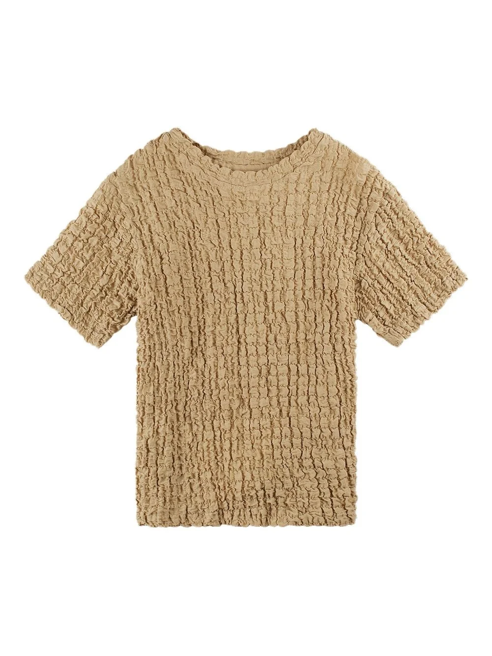 Camo T-shirt Highlights - Beige - Fully ruffled - Crew neck - Short sleeves - Straight hem Imported Composition Cotton 73%, Nylon 25%, Polyurethane 2% Washing instructions Read Manufacturer Guidelines