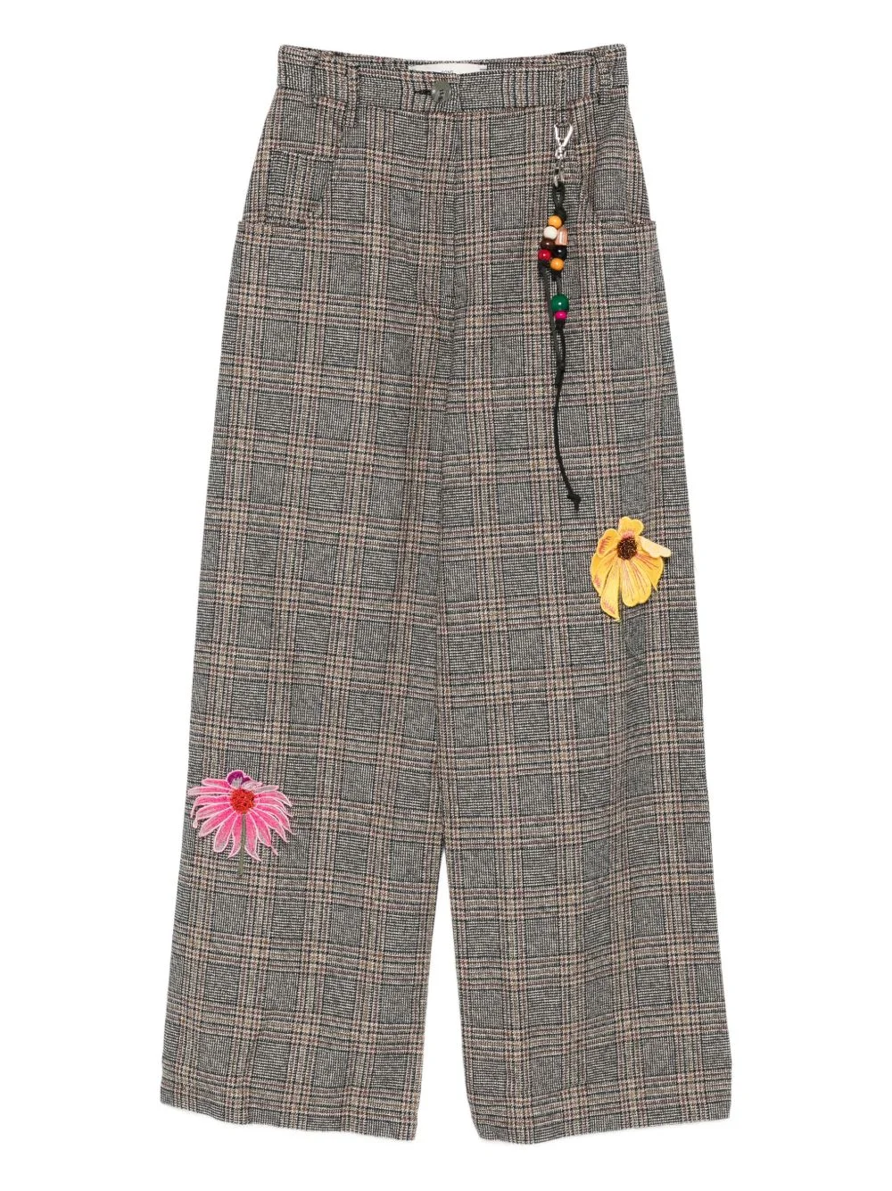 floral-applique checked trousers Highlights - Brown - Check pattern - Floral applique - Bead embellishment - Classic five pockets - Belt loops Imported Composition Cotton 100% Washing instructions Read Manufacturer Guidelines