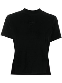 slit detail crew neck T-Shirt Highlights - Black - Cotton-blend - Embroidered logo - Crew neck - Short sleeves - Side slits Imported Composition Cotton 80%, Spandex/Elastane 20% SIZE & FIT Model measurements Height 5 ft 10 in(1.78 m) Bust/Chest 33.07 in(84 cm) Hips 35.82 in(91 cm) Waist 25.98 in(66 cm) FittingInformation This piece fits true to size. We recommend you get your regular size Cut for a slim fit Made with a mid-weight stretch fabric Washing instructions Hand Wash