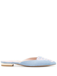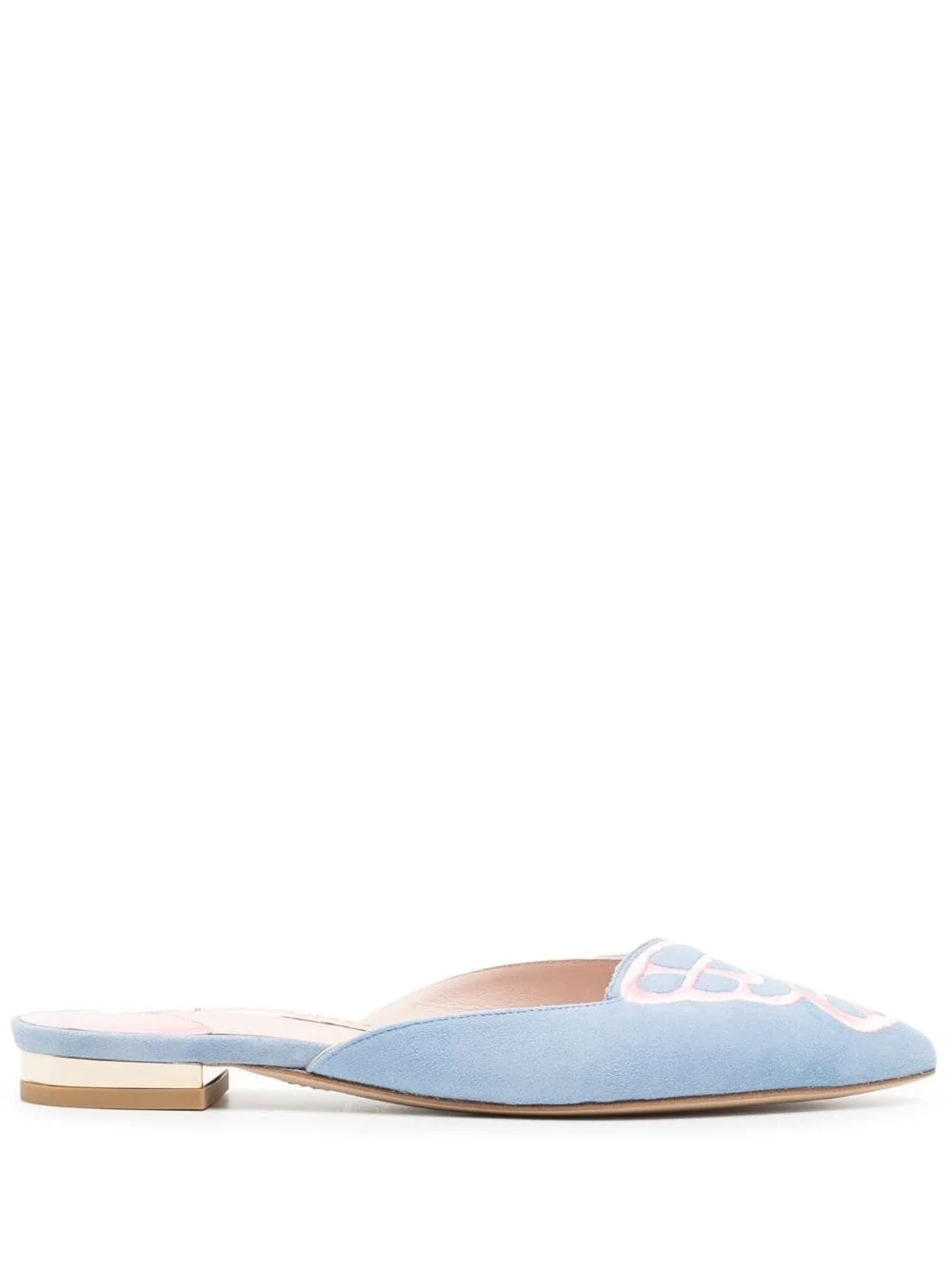 Butterfly suede mules Characterised by the label's whimsical aesthetic, these Sophia Webster mules are embroidered at the vamp with a hallmark butterfly wing motif that appears in a soft pink hue. They're elevated by a polished gold-tone accent at the low stacked heel. Highlights - Powder blue - Suede - Signature butterfly detailing - Embroidered design - Pointed toe - Slip-on style - Branded footbed - Leather sole - Low stacked heel Made in Italy Composition Suede 100% SIZE & FIT Measurement HEEL 0.78 in(2 cm) Sole height 0.19 in(0.5 cm)
