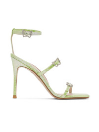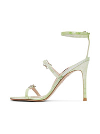 Croc-embossed patent leather heeled sandals in green. · Open squared toe · Pin-buckle straps with crystal-cut graphic hardware · Logo patch at padded leather footbed · Covered stiletto heel with rubber injection · Graphic topstitching at leather sole · Heel: H4 in Supplier color: Mint croc Upper: leather. Sole: leather, rubber. Made in Spain 232504F125061