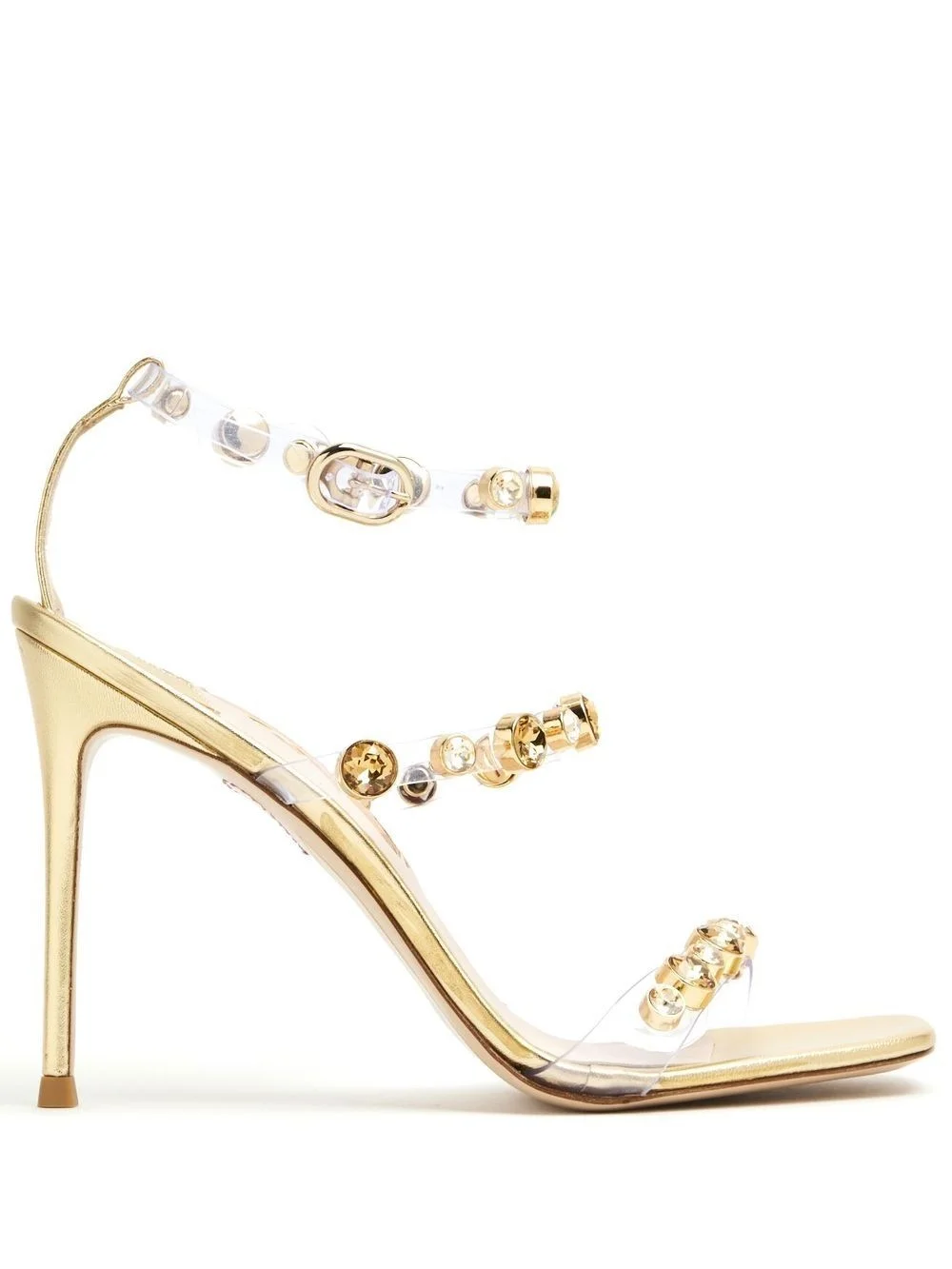 Rosalind 100mm gem-embellished sandals Presented in this gold-tone hue, Sophia Webster's Rosalind sandals embody elegance. Defined by their renowned transparent multi-strap fastening coated in glass gems upon a 100mm sleek stiletto heel. Made in Italy Composition Sole: Leather 100% Outer: Vinyl 100%, Crystal 100% Lining: Leather 100% SIZE & FIT Measurement HEEL 3.93 in(10 cm)