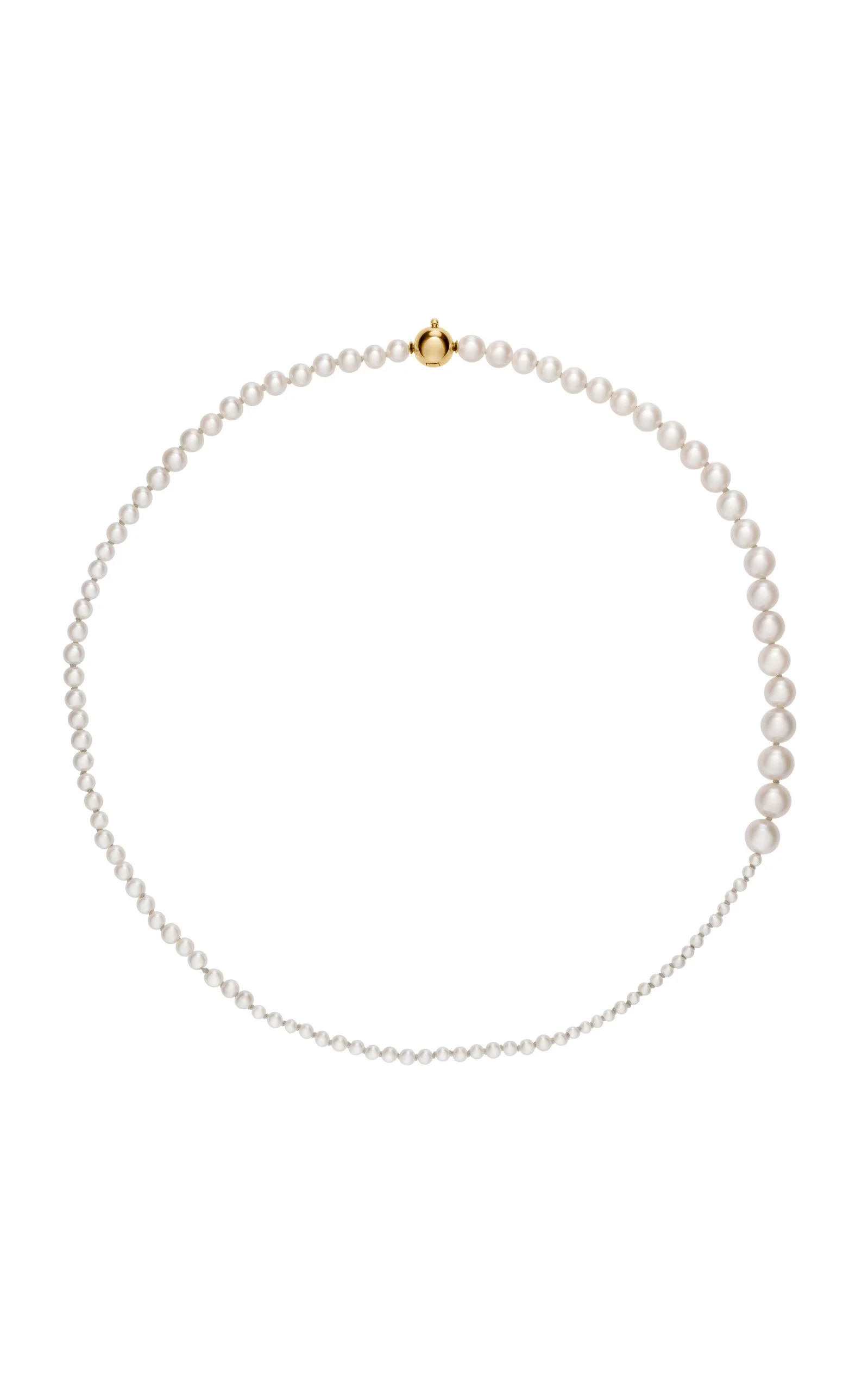 Sophie Bille Brahe's 'Petite Peggy' necklace takes a modern interpretation of a classic pearl necklace with graduating pearls that pair perfect alone or layered. PRODUCT DETAILS - Hidden lock closure - Composition: 14K yellow gold, freshwater pearls - Color: White - This product is crafted with natural pearls, and variations make each piece unique - Made in Denmark SIZE & FIT - Necklace measures 40 cm long
