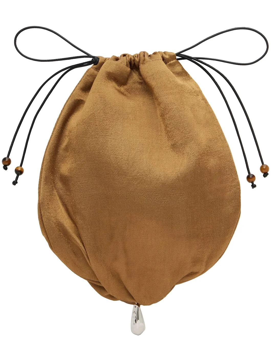 Handcrafted viscose satin pouch. · Sterling silver charm at base · Tiger's eye beads at faux-leather drawstring closure · Logo plaque at interior · H9" x W7.25" Supplier color: Bronze 100% viscose. Made in United States 252942F045000