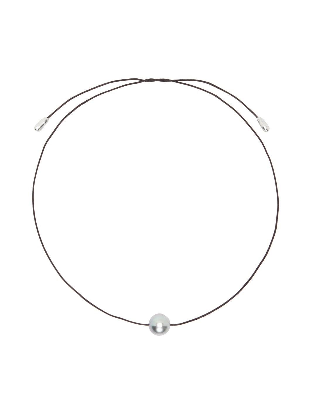 Handcrafted satin cord choker in brown. · Tahitian pearl at face · Pull-through fastening · Sterling silver hardware · L21" Supplier color: Peacock pearl