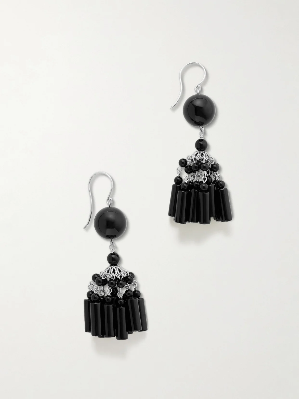 Inspired by Flamenco dancers, Sophie Buhai's earrings are designed in a chandelier shape that moves beautifully, like "tassels for your ears". They're cast from silver and strung with spherical and elongated onyx beads.