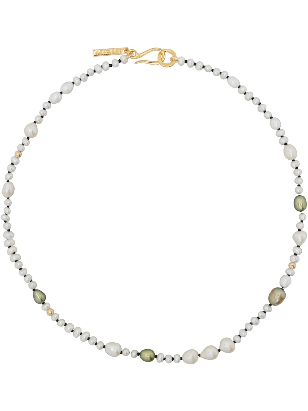 Handcrafted beaded freshwater pearl necklace in white. · Logo plaque at hook-eye fastening · 18k gold vermeil hardware · L15" Supplier color: Pearl Freshwater pearl, 18k gold, 925 sterling silver. Made in United States 252942F023024