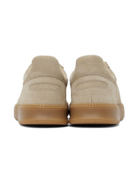 Low-top paneled suede sneakers in beige. · Lace-up closure · Padded tongue and collar · Perforated detailing at inner side · Buffed calfskin and mesh lining · Treaded rubber sole Supplier color: Sand Upper: leather. Sole: rubber. Made in Slovakia (Slovak Republic) 231818F128024