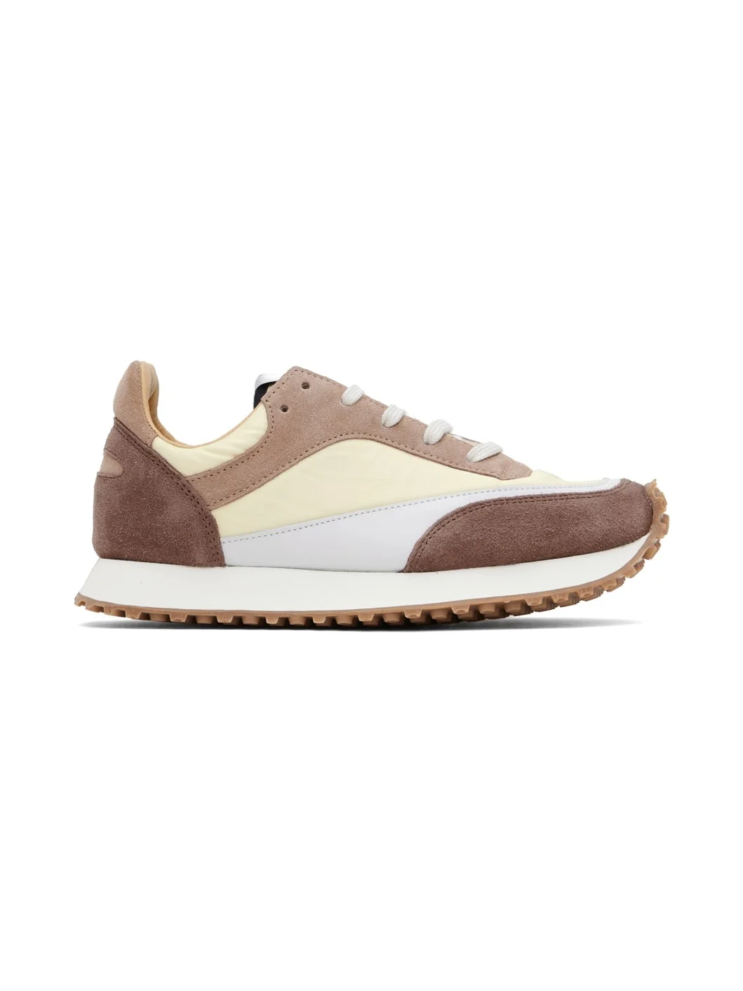 Low-top paneled suede, nubuck, and canvas sneakers in brown and beige. · Lace-up closure · Logo patch at padded tongue · Padded collar · Buffed leather and mesh lining · Foam rubber midsole · Treaded rubber outsole Supplier color: Nougat Upper: leather, textile. Sole: rubber. Made in Slovakia (Slovak Republic) 231818F128027