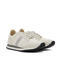 Low-top paneled canvas, suede, and buffed leather sneakers in white. · Lace-up closure · Logo patch at padded tongue · Padded collar · Text stamped at outer side · Buffed calfskin and mesh lining · Stacked foam rubber midsole · Treaded rubber sole Supplier color: White Upper: textile, leather, calfskin. Sole: rubber. Made in Slovakia (Slovak Republic) 241818F128035