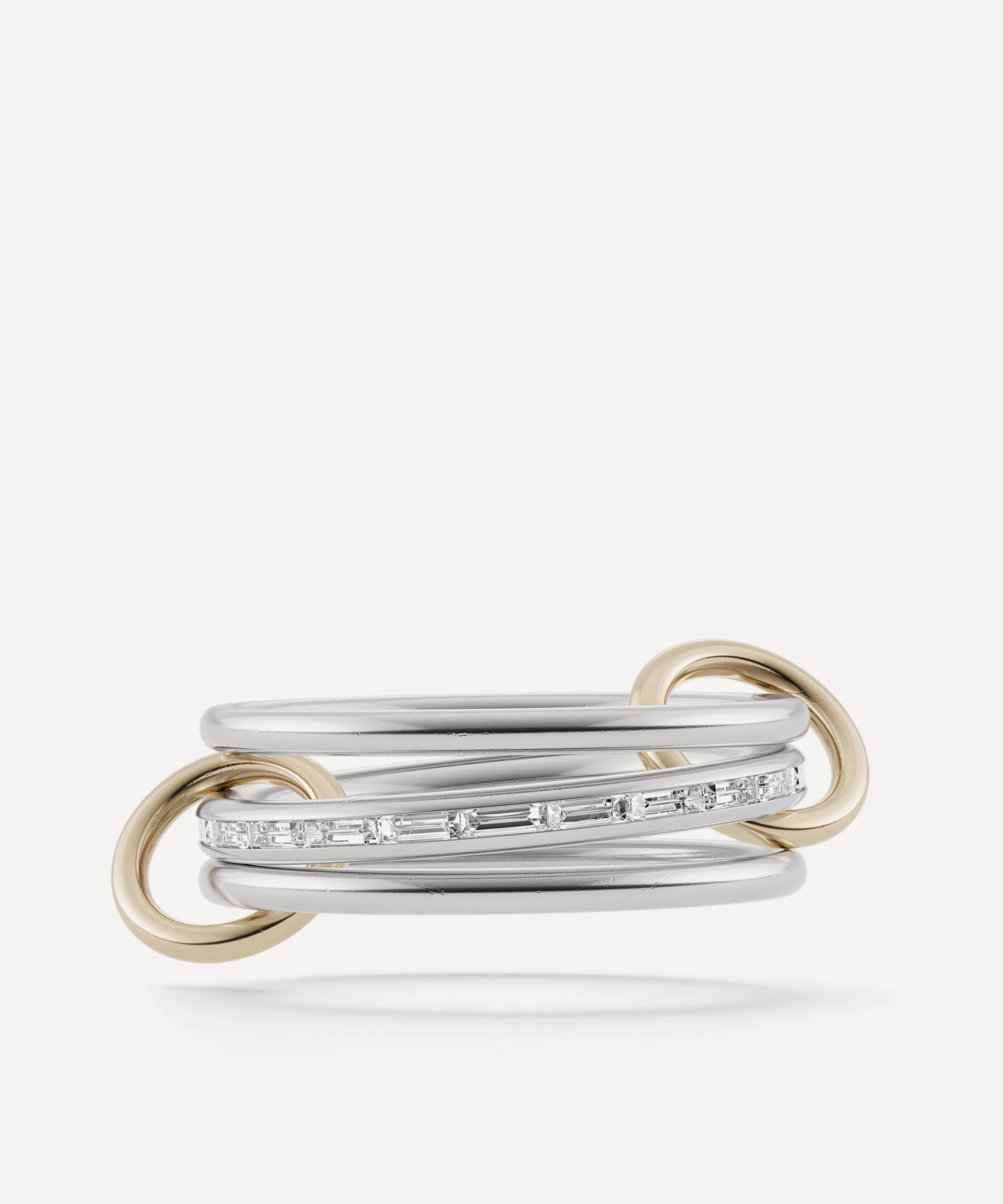 DETAILS Ring 18ct white gold linked bands 18ct gold connectors Channel set, baguette cut diamonds Handcrafted in Los Angeles COMPOSITION & SIZE 18ct Gold; 18ct White Gold; Estimated 1ct White Diamond This ring comes in size M only UK: M, US: 6 ½, EUR: 52 ½