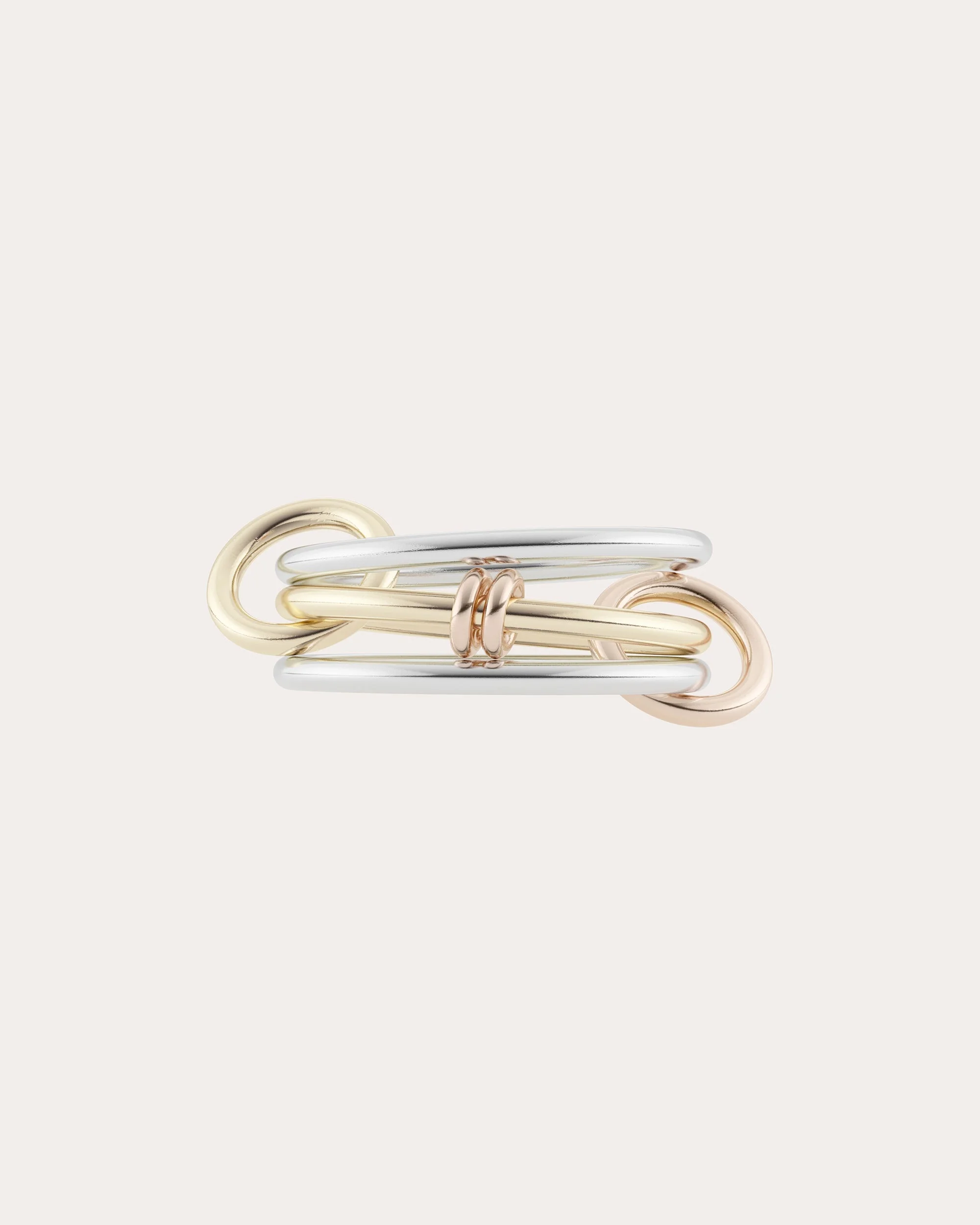 A celebration of modular simplicity, the Acacia ring features a trio of sterling silver and 18k gold bands joined by connecting links that allow the piece to be worn stacked on one finger or spread across multiple. Two orbiting rose gold annulets encircle the center band for a truly dynamic finish. 18k yellow gold, 18k rose gold and sterling silver Polish with soft cloth Handmade in Los Angeles, USA Measurements Band width (each): 1.7mm Sustainability Metrics: Circular Economy: product is intentionally designed with 50% of actively cycled materials Conflict-Free: 100% of products are recycled or conflict-free and adhere to fair trade and labor Craft & Community: at least 75% of products are fully sourced and manufactured within the specified community or country; 100% of production adheres to a fair wage system Read more about Olivela's sustainability pillars here .