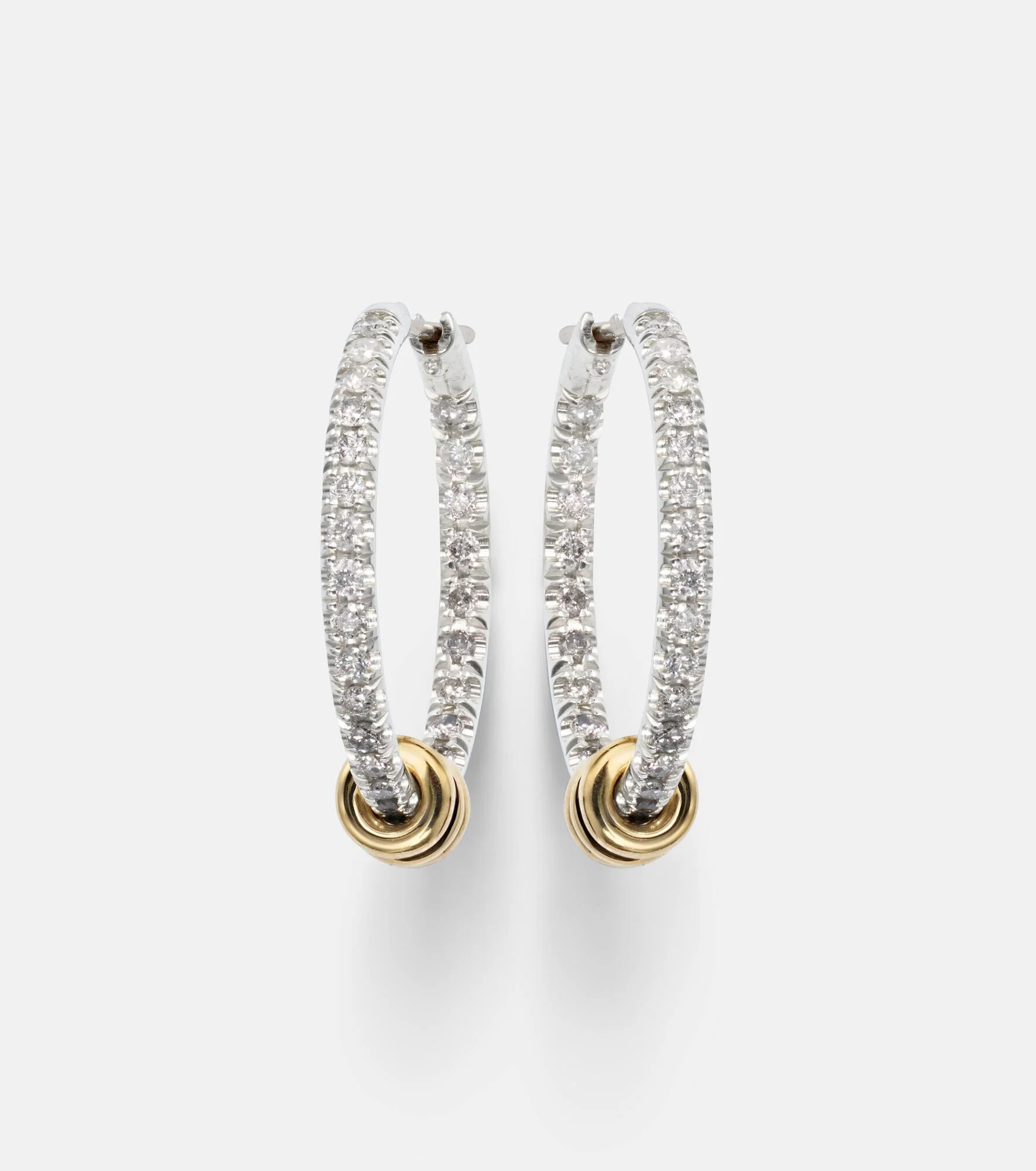 Spinelli Kilcollin's jewelry is handcrafted locally by a team of artisans in Los Angeles. The Argo Demi hoop earrings are made from sterling silver and feature pave-set diamonds and 18kt yellow gold annulets. Product Details - Material: 925 sterling silver, 18kt yellow gold - Made in the USA - Item color: silver - Stone I: 52 diamonds, VS1 clarity grade, G color grade, pave setting, 1.25ctw - Item number: P01071829 Size & Fit - Min. width 2mm-0.1" - Max. width 5mm-0.2" - Inner diameter 21mm-0.85"