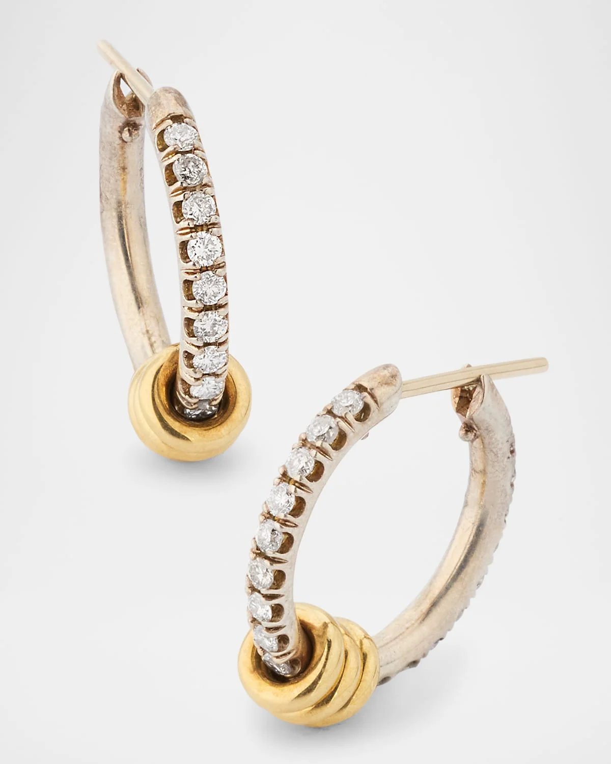 - Spinelli Kilcollin hoop earrings in polished sterling silver - 18-karat yellow gold accents - Pave diamonds, 0.3 total carat weight - Approx. 0.5"L (13mm) - 2mm gauge - Post backs for pierced ears - Made in USA