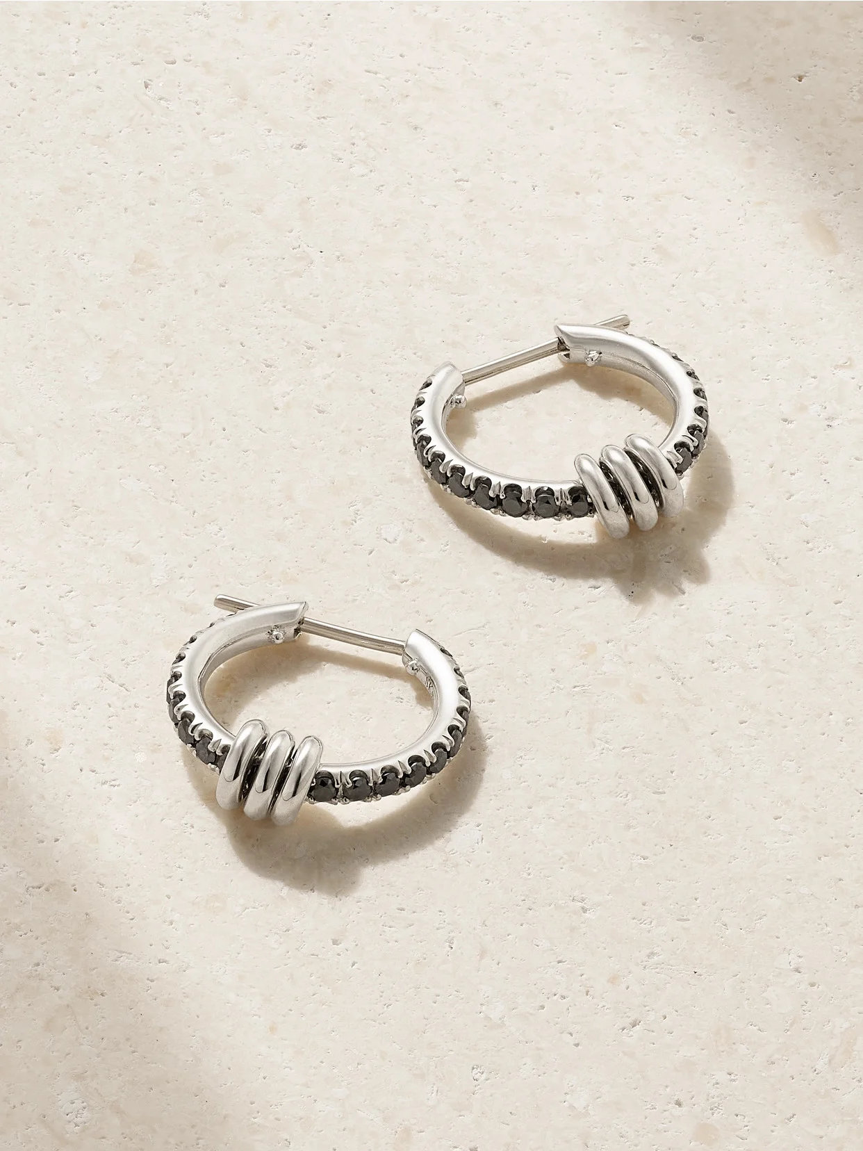 Spinelli Kilcollin's 'Ara' earrings have been handcrafted in Downtown Los Angeles from sterling silver by a small team of craftspeople. They're encrusted with sparkling blackened diamonds along the hoop shape, as well as three dainty annulets.