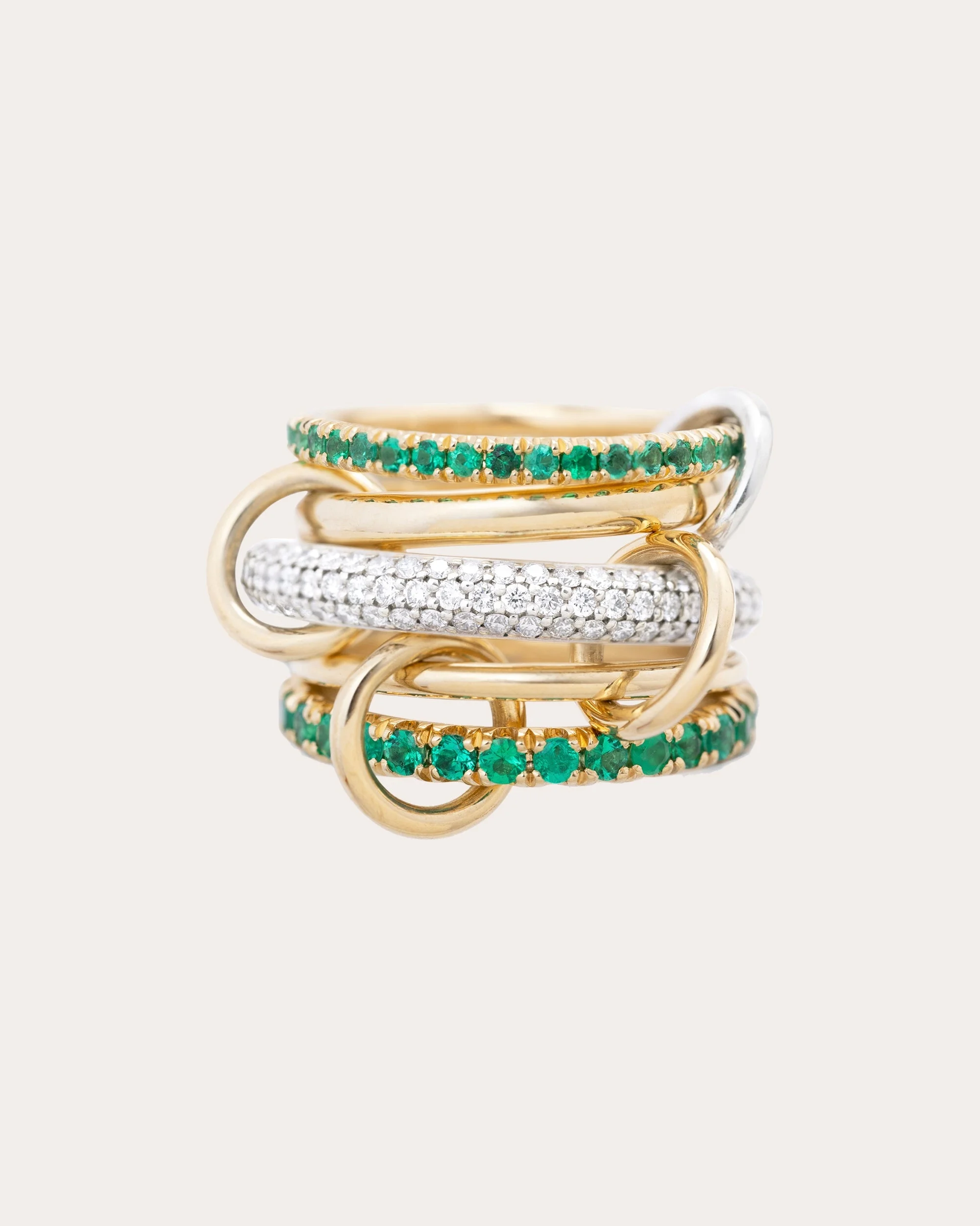 Balanced and iconic, this ring pairs 18k yellow gold and .925 sterling silver across five, multi-gauged bands of solid metal and pave construction. Outer emerald bands frame the central, .925 sterling silver band set with micro-pave white diamonds Mixed connectors link each ring so you can wear spread across multiple fingers or stacked as a sculptural whole. 18k yellow gold, emerald, and white diamond Diamond and emerald combine carat: 3.30 ctw Diamond color: white Polish with soft cloth Handmade in Los Angeles, USA If you would like to consult with a fine jewelry expert, please email us at jewelryconcierge@olivela.com. Measurements Band 1 (top) width: 2.3mm/li> Band 3 width: 3.8mm/li> Band 4: 1.7mm/li> Band 5: 2.8mm/li> Need help with sizing? Download our ring size guide or get in touch with a fine jewelry expert by emailing us at jewelryconcierge@olivela.com .