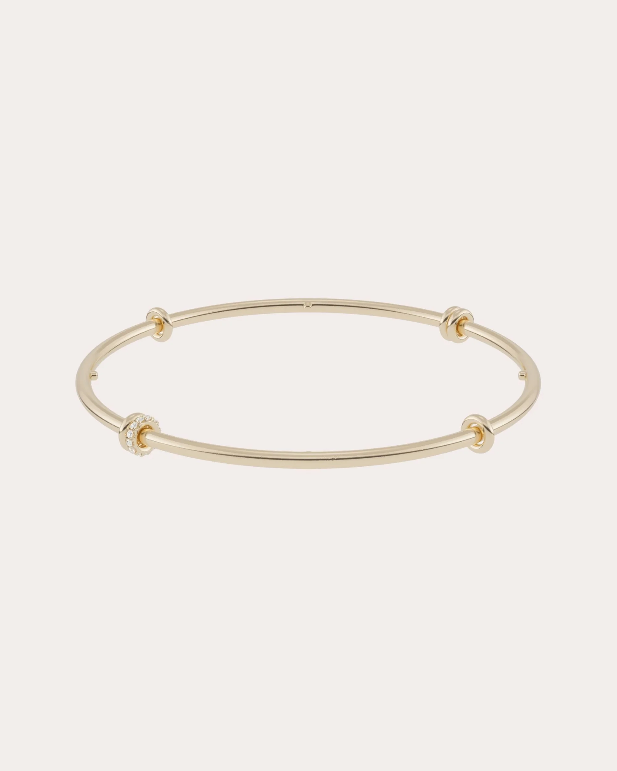 A study in minimalism, the Kini bangle is crafted from solid 18-karat gold. Six orbiting annulets—one decorated with pave-set diamonds—give nod to Spinelli Kilcollin's signature tactile aesthetic. 18k yellow gold and white diamond Diamond carat: 0.09 ctw Diamond color: G Diamond clarity: VS1 Polish with soft cloth Handmade in the USA If you would like to consult with a fine jewelry expert, please email us at jewelryconcierge@olivela.com. Measurements Bangle width: 2.3mm