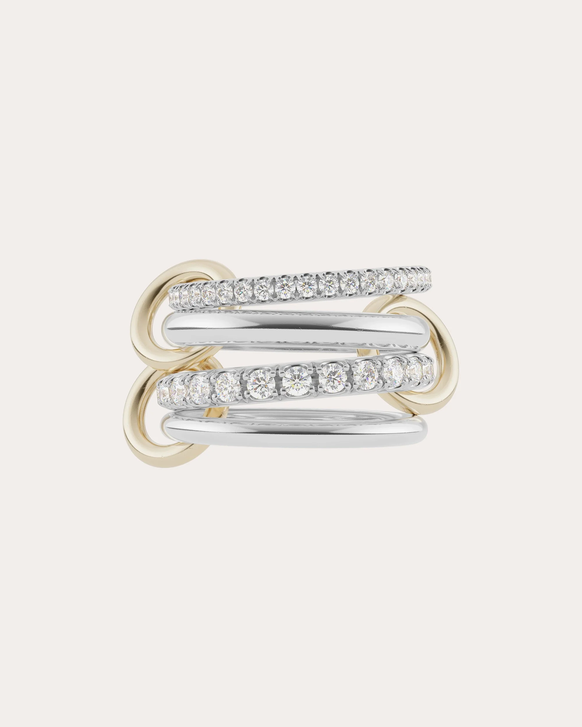 A signature Spinelli creation, the Halley ring decorates two of its four sterling silver bands with pave-set diamond embellishments. Three 18k gold orbiting annulets create a linked design that can be worn stacked on one finger or spread across multiple. Sterling silver, 18k yellow gold and white diamond Diamond carat: 1.9 ctw Professional jewelry clean Handmade in the USA If you would like to consult with a fine jewelry expert, please email us at jewelryconcierge@olivela.com. Measurements First and fourth band width: 2.3mm Second band width: 2.7mm Third band width: 2.8mm Need help with sizing? Download our ring size guide or get in touch with a fine jewelry expert by emailing us at jewelryconcierge@olivela.com .