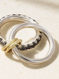 Spinelli Kilcollin's 'Enzo' ring is handmade from sterling silver and features one band completed encrusted with 2.15-carats of black diamonds. It's connected by 18-karat gold links, which allow you to wear them stacked atop each other or spread across two fingers. Size & Fit - US sizing - Measurements can be found in the link below Details & Care - Round brilliant-cut VS2 diamonds, total weight: 2.15-carats - The black color of these diamonds is the result of an artificial treatment process - This piece is handmade and as such may have some small flecks or scratches - This piece has been certified in accordance with the Hallmarking Act 1973
