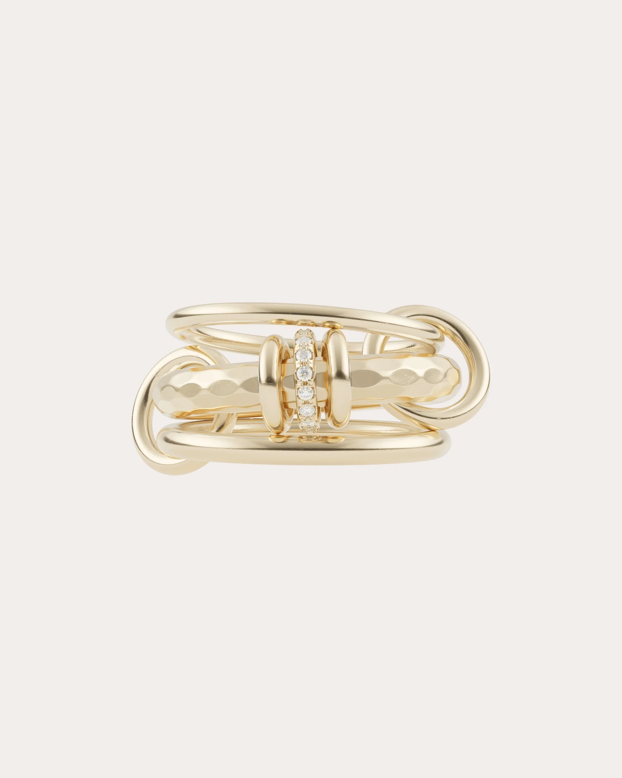 True to the sign's flexibly expressive nature, the Gemini ring features three 18-karat gold bands joined by connecting links that allow the piece to be worn stacked on one finger or spread across multiple. The hammered center band is decorated with a diamond-embellished orbiting annulet for shimmering appeal. 18k yellow gold and white diamond Diamond carat: 0.09 ctw Polish with soft cloth Made in the USA If you would like to consult with a fine jewelry expert, please email us at jewelryconcierge@olivela.com. Measurements Top band width: 1.7mm Middle band width: 3.8mm Bottom band width: 2.3mm