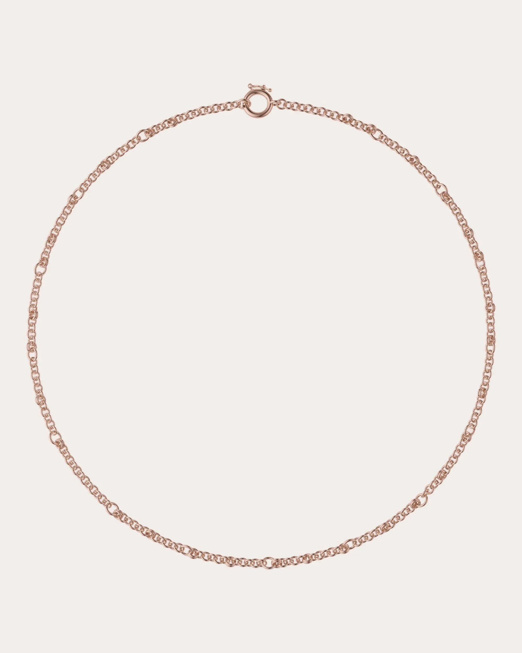 A study in balanced minimalism, the Gravity necklace is forged in 18-karat rose gold and showcases a handmade roll chain comprised of double and various-sized links. Seamless circular clasp with safety closure 18k rose gold Polish with soft cloth Handmade in the USA Size & Fit Chain length: 18in Sustainability Metrics: Circular Economy: product is intentionally designed with 50% of actively cycled materials Conflict-Free: 100% of products are recycled or conflict-free and adhere to fair trade and labor Craft & Community: at least 75% of products are fully sourced and manufactured within the specified community or country; 100% of production adheres to a fair wage system Read more about Olivela's sustainability pillars here .