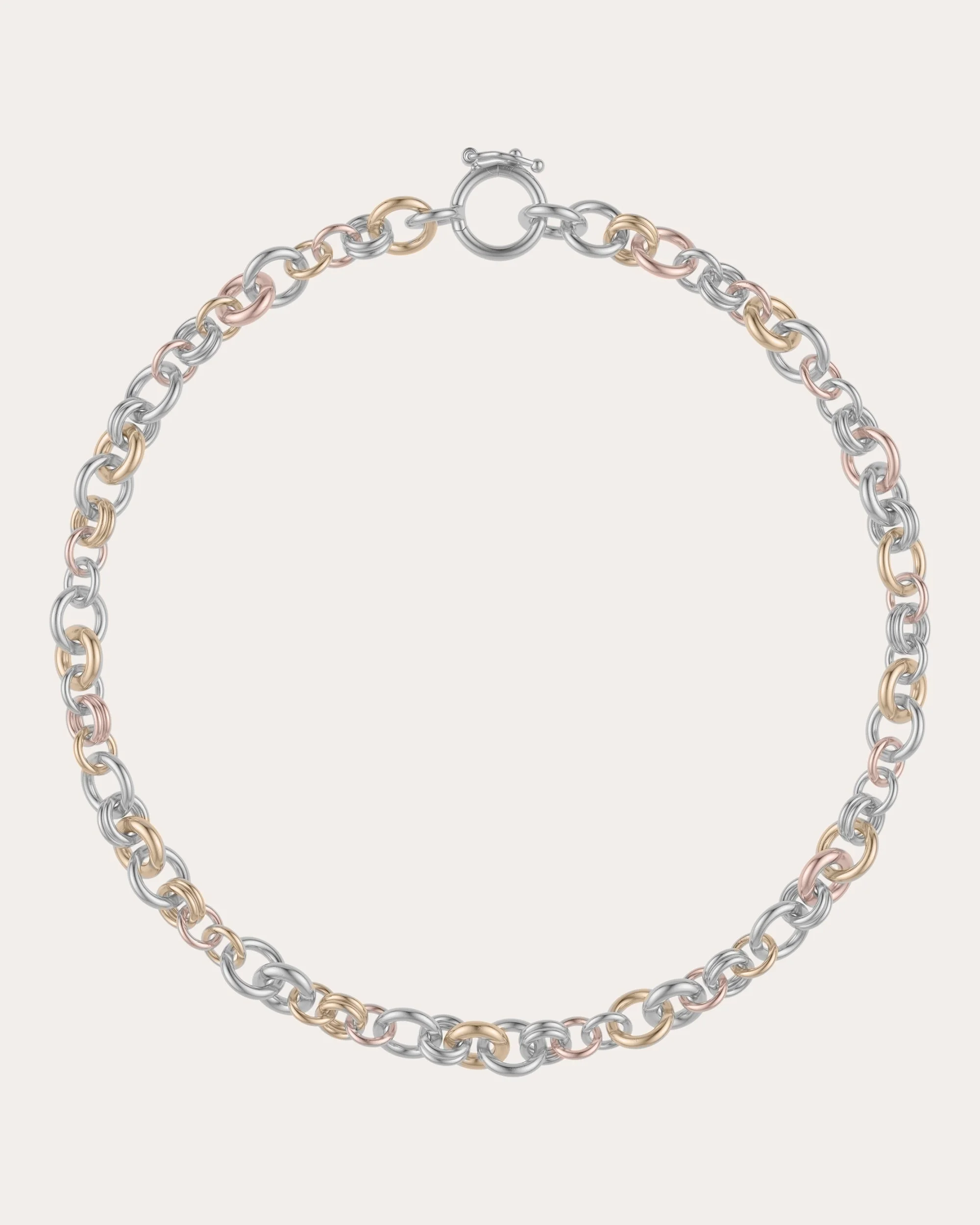 Emulating duality with its mix of sterling silver and 18k gold metals, the Helio chain bracelet is comprised of hand-rolled double links in varying gauges and widths for a fluid, seamless look. Seamless circular clasp with safety closure Sterling silver and 18k gold Polish with soft cloth Handmade in the USA Sustainability Metrics: Circular Economy: product is intentionally designed with 50% of actively cycled materials Conflict-Free: 100% of products are recycled or conflict-free and adhere to fair trade and labor Craft & Community: at least 75% of products are fully sourced and manufactured within the specified community or country; 100% of production adheres to a fair wage system Read more about Olivela's sustainability pillars here .