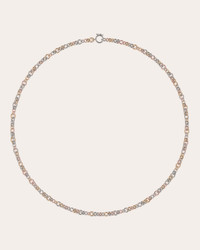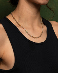Emulating duality with its mix of sterling silver and 18k gold metals, the Helio chain necklace is comprised of hand-rolled double links in varying gauges and widths for a fluid, seamless look. Seamless circular clasp with safety closure 18k gold and sterling silver Polish with soft cloth Handmade in the USA Size & Fit Chain length: 18in Sustainability Metrics: Circular Economy: product is intentionally designed with 50% of actively cycled materials Conflict-Free: 100% of products are recycled or conflict-free and adhere to fair trade and labor Craft & Community: at least 75% of products are fully sourced and manufactured within the specified community or country; 100% of production adheres to a fair wage system Read more about Olivela's sustainability pillars here .