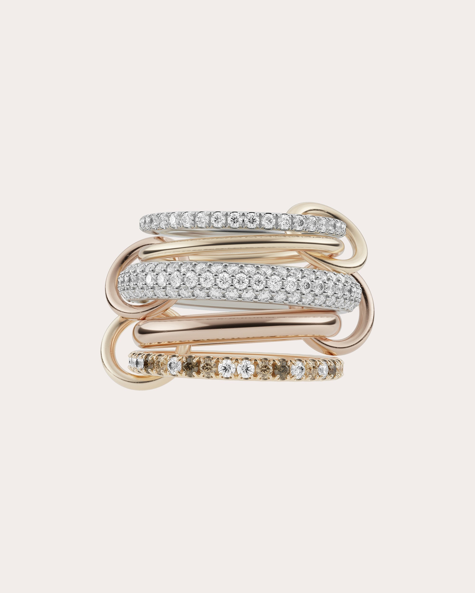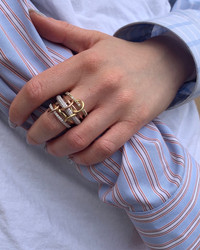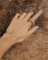 Comprised of five bands in varying gauges and 18-karat gold tones, the Leo ring decorates its first, third and fifth bands with a neutral-hued array of shimmering diamond embellishments. Orbiting annulet connectors create a linked design that can be worn stacked on one finger or spread across multiple. 18k yellow gold, 18k rose gold, 18k white gold, white diamond, cognac diamond and champagne diamond Diamond carat: 3.2 ctw Polish with soft cloth Made in the USA Measurements Band widths (top to bottom): 1.7mm, 1.7mm, 3.8mm, 2.7mm, 2.3mm Sustainability Metrics: Circular Economy: product is intentionally designed with 50% of actively cycled materials Conflict-Free: 100% of products are recycled or conflict-free and adhere to fair trade and labor Craft & Community: at least 75% of products are fully sourced and manufactured within the specified community or country; 100% of production adheres to a fair wage system Read more about Olivela's sustainability pillars here .
